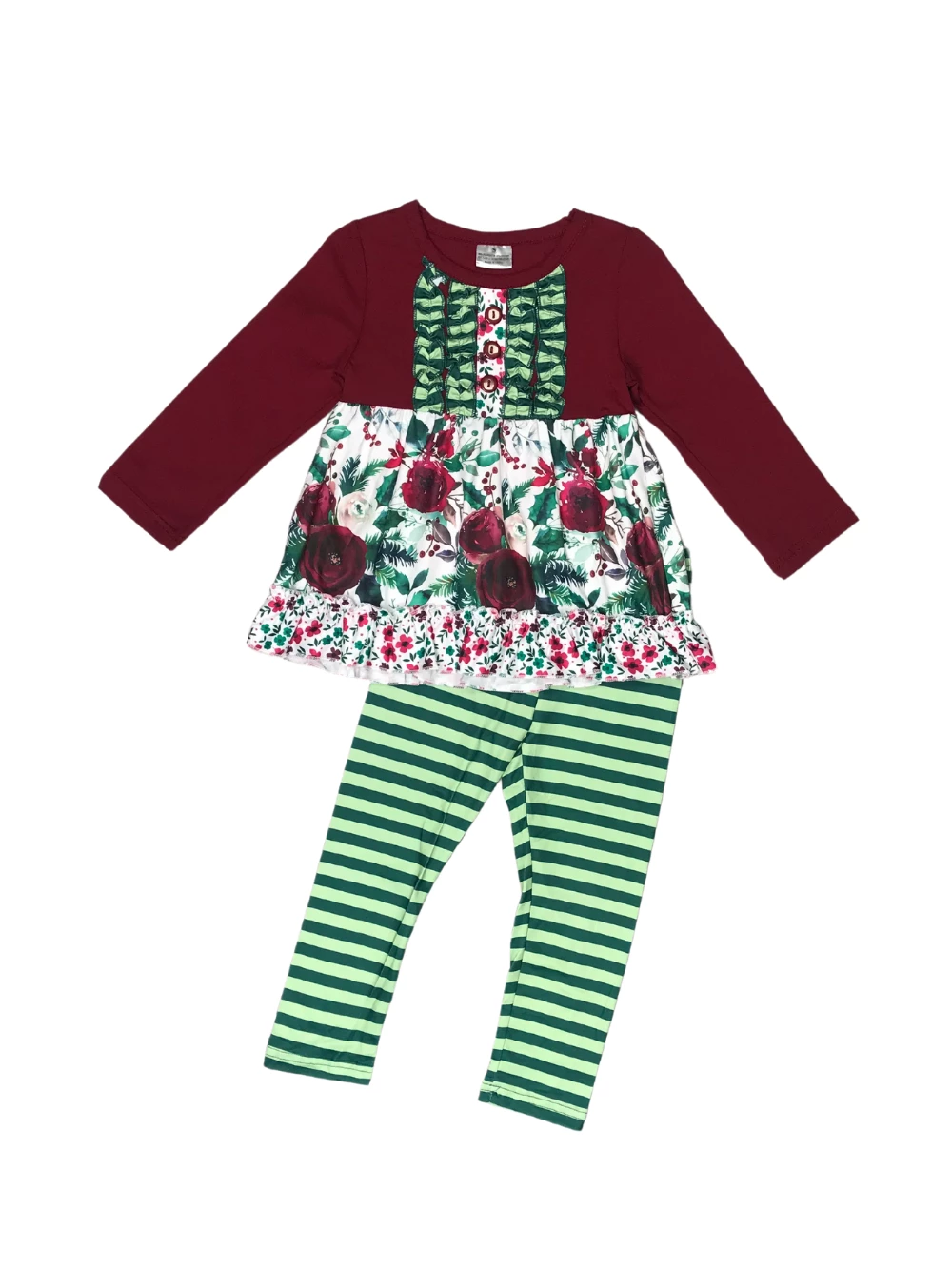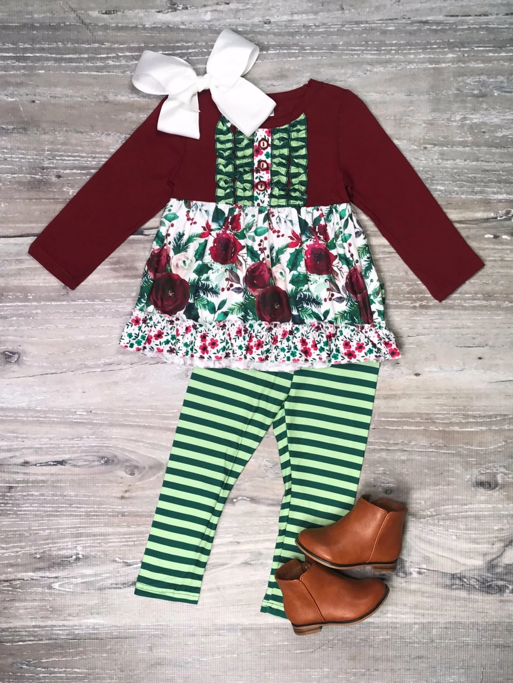 Spoil your little style icon with our Deep Burgundy Green Stripe Floral Ruffle Girls Outfit! The adorable set comes with a burgundy long sleeve top that features a floral pattern, ruffle detailing, and buttons. The set also comes with a pair of coordinating green and white striped leggings. We are loving this enchanting set with some brown booties and a coordinating burgundy or green hair bow. The set is perfect for running errands, photoshoots, playdates, shopping trips, school, and so much more. Pick up this outfit for her holiday wardrobe and be sure to checkout our other must have two piece outfits!
