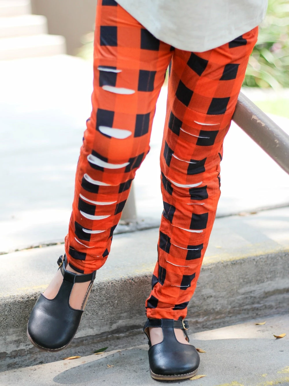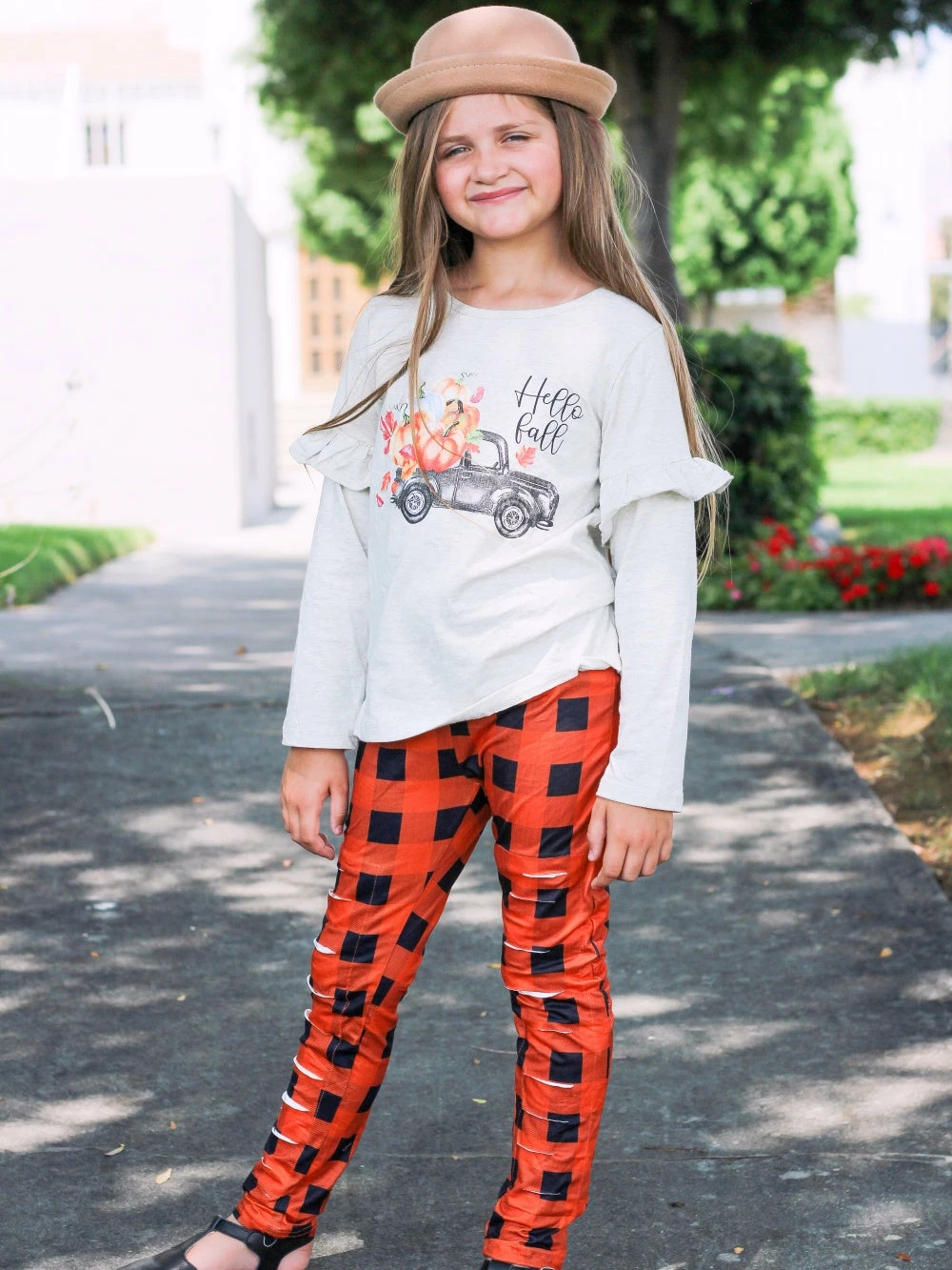 Spice up her fall style with our unique and trendy Pumpkin Truck Orange Plaid Distressed Patch Leggings Girls Outfit! The stylish set comes with a heathered cream long sleeve top that features the phrase “Hello Fall,” a pumpkin truck detail, and ruffle detailing along the sleeves. The set also comes with a funky pair of orange plaid patterned leggings that feature distressed detailing with a white patch underneath as well as an elastic waistband. We are loving this outfit with a pair of boots and a fall colored hair bow. The set is perfect for running errands, fall photos, trips to the pumpkin patch, and so much more! Buy now, girlies!