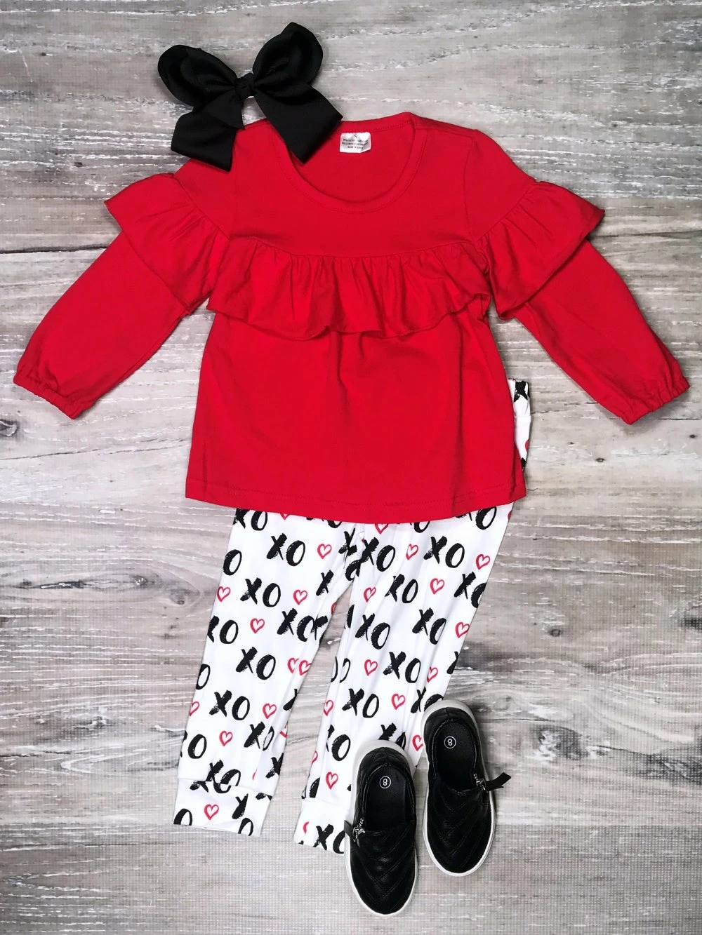 Kiss those basic outfits goodbye and say hello to our XOXO Y’all Red Ruffle Girls Valentine’s Day Outfit! The set comes with a red long sleeve top that features ruffle detailing and scrunched sleeves. The set also comes with a pair of coordinating xoxo patterned leggings. We are loving this lovely set with some booties or sneakers and a coordinating red hair bow. The set is perfect for school, parties, playdates, Valentine’s Day festivities, and so much more. Pick up this outfit while your little valentine’s size is still in stock and be sure to check our our other holiday sets.