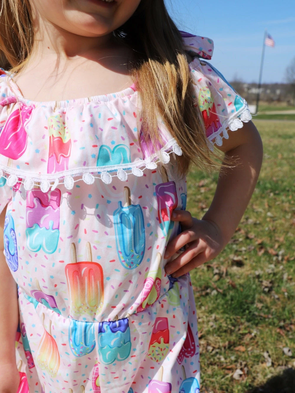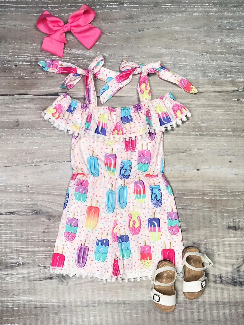 Sweeten up her summer with our darling Anything Is Popsicle Treats Pink Pom Pom Girls Shorts Romper! The romper features a vibrant popsicle pattern, tie straps, cold shoulder cut, and ruffle overlay. The romper also features pom trim which gives it that extra little sassy detail. We are loving this romper for vacations, parties, playdates, trips to the ice cream shoppe, and so much more. Just pair this romper with some sneakers or sandals and a coordinating hair bow and you’ll be ready to take on the day. Pick up this best selling romper for your little sweetie and be sure to checkout our other trend setting pieces and outfits.