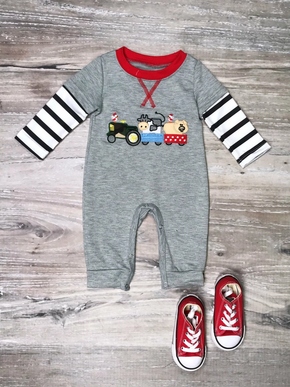 Embrace the farm life with our Around The Farm Tractor Gray Stripe Long Sleeve Baby Boys Romper! The gray long sleeve romper features a striped pattern along the sleeves, a tractor detail, red trim, and snaps along the bottom. We are loving the snaps as they make for quick and easy diaper changes. The romper is perfect for lazy days at home, playdates, running errands with mama, and so much more. Just pair the romper with some sneakers or booties and your little man will be ready to take on the day. Be sure to checkout our other best selling baby rompers.