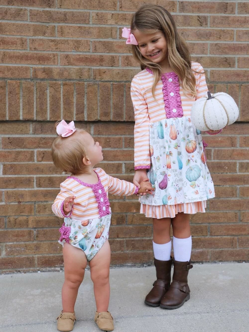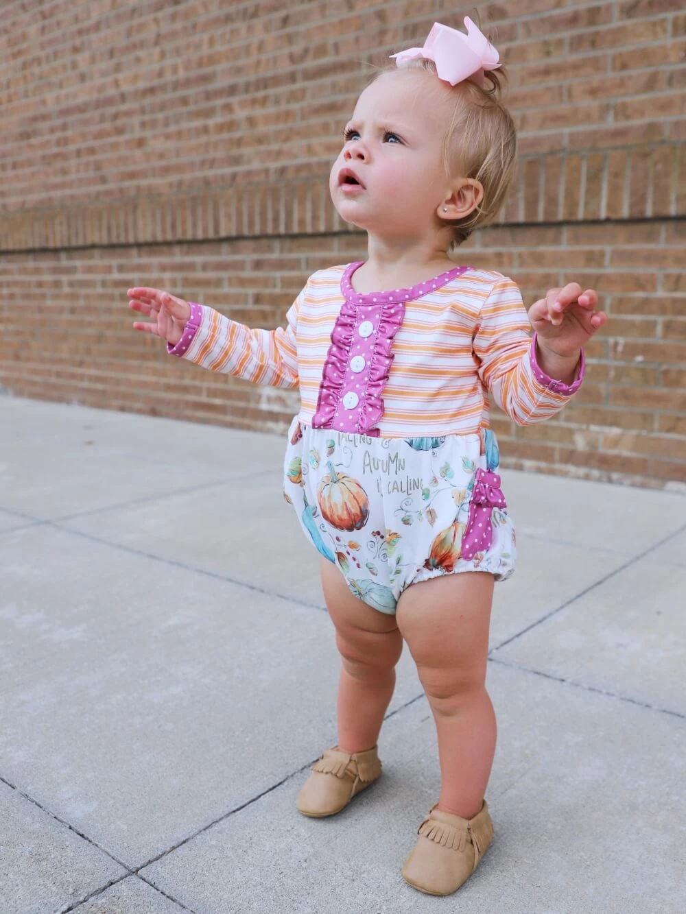 Get her ready for fall with our classic and chic Autumn Is Calling Orange Stripe Pumpkin Girls Fall Baby Romper! The long sleeve romper features an orange striped pattern, a pumpkin pattern, buttons, a criss cross back, a purple polka dot pattern, and a snap bottom to make for quick and easy diaper changes. The romper is perfect for playdates, running errands, fall photos, trips to the pumpkin patch, and so much more. Just pair the romper with a fall colored hair bow and a pair of brown booties and she’ll be ready to take on the autumn day. Pick up this fall romper while it’s still in stock and check out our other fall favorites!Â