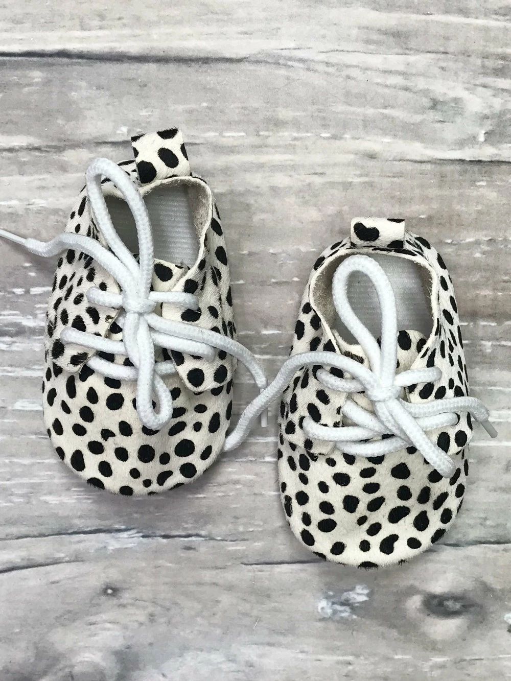 What’s that? We’ve spotted our fashion forward Cream Spotted Tie Baby or Toddler Moccasins. The cream moccasins features a black spotted pattern and white laces to make for the optimal fit. The shoes are perfect for parties, playdates, running errands, photoshoots, and so much more! Your little one can pair the shoes with dresses, jeans, leggings, skirts, and so much more! Pick up these fashion forward shoes while they’re still in stock and checkout our other stylish shoes.