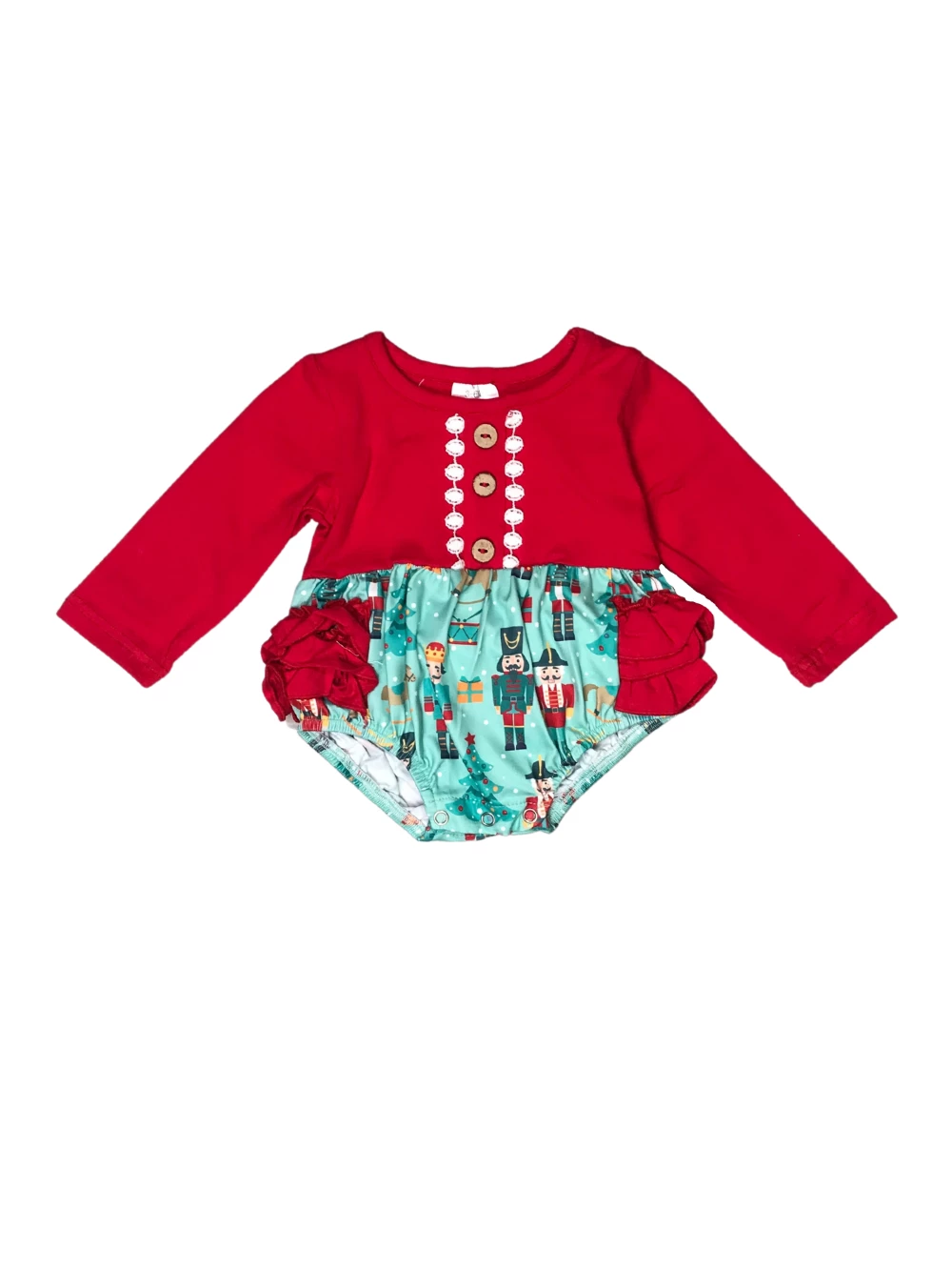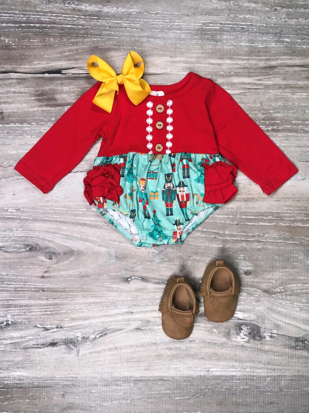 Spoil your little sugarplum with our sassy Nuts About Nutcracker Red Ruffle Girls Christmas Baby Romper! The red long sleeve romper features a blue nutcracker pattern along the bottom, buttons, ruffle detailing, and snaps along the bottom. We are loving the snaps as they make for quick and easy diaper changes. Just pair the romper with some brown booties or sneakers and a red hair bow and she’ll be ready to go! The romper is perfect for holiday plays, parties, playdates, shopping trips, lazy days at home, running errands, and so much more! Pick up this romper while her size is still in stock and be sure to checkout our other must have holiday pieces.