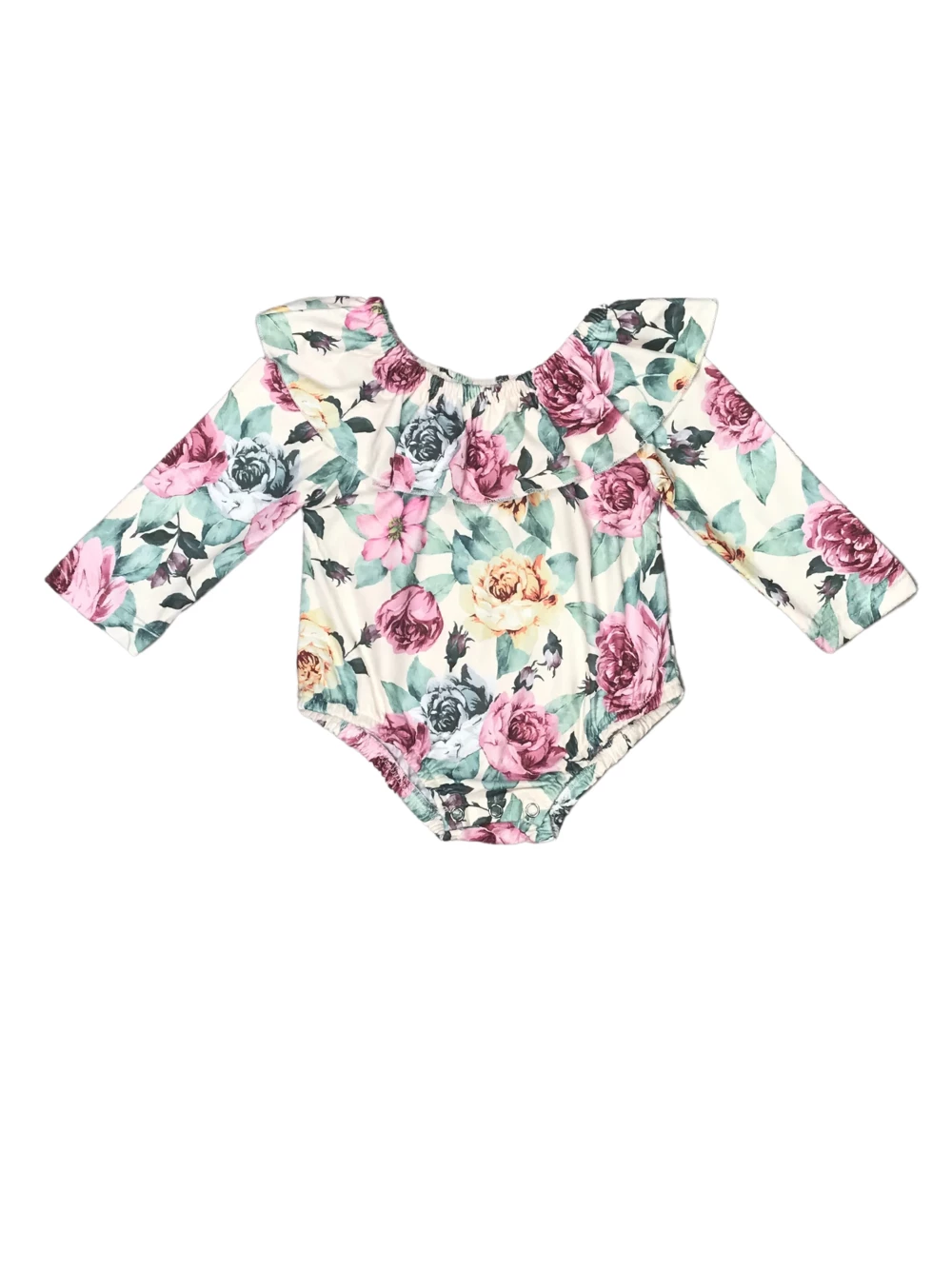 Treat your little rose bud to our enchanting and precious White Rose Floral Ruffle Baby Romper! The white long sleeve baby romper features a rose floral pattern, a ruffle overlay, cold shoulder cut, and snaps along the bottom. We love how the snaps make getting ready and diaper changes so much easier. The romper is perfect for playdates, running errands, photoshoots, lazy days at home, and so much more. Just pair the romper with some brown booties and a hair bow and your little cutie will be ready to take on the day. Don’t forget to checkout our other baby rompers that we know you’ll love!