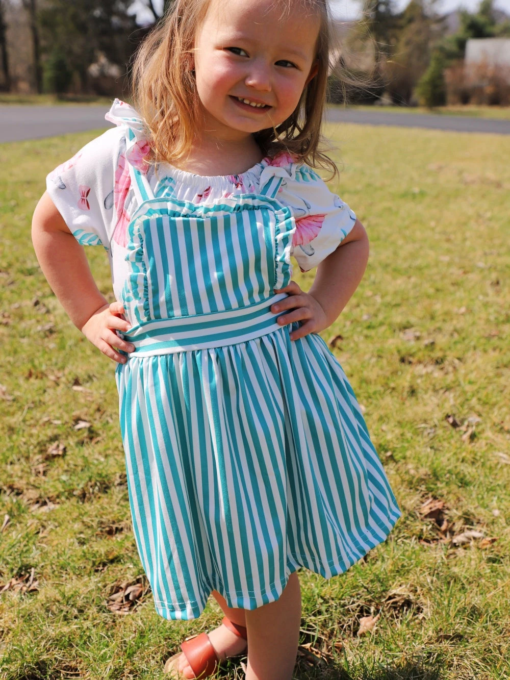 Jump into the Easter season with our adorable Ballerina Bunny Teal Stripe Ruffle Girls Easter Jumper Dress Set! The set comes with a short sleeve top that features a ballerina bunny pattern and ruffle trim. The set also comes with a sleeveless dress that features a teal and white striped pattern, ruffle trim, and a cinched waistline. We are loving how your little one can mix and match both pieces with items that she already has in her wardrobe. The outfit is perfect for egg hunts, school, running errands, and so much more. Just pair the set with some sandals and a hair bow and your little will be good to go. Pick up this dress set and be sure to checkout our other must have Easter dresses and sets.