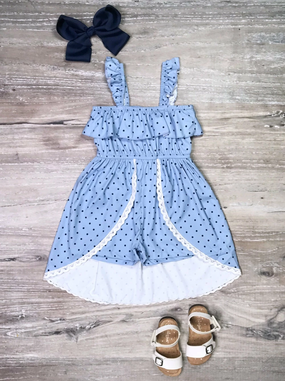 Keep your little star looking stylish in our adorable Blue & Navy Polka Dot Lace Ruffle Girls Flyaway Shorts Romper! The darling blue sleeveless romper features a navy polka dot pattern, ruffle detailing, lace trim, and a flyaway overlay. We are just loving this enchanting romper with some enchanting white sneakers or sandals and a coordinating navy blue hair bow. The best selling polka dot patterned romper is perfect for parties, vacations, playdates, family photos, shopping trips, and so much more. Add this romper to her collection while it’s still in stock and be sure to take a look at our other fashionable favorites.