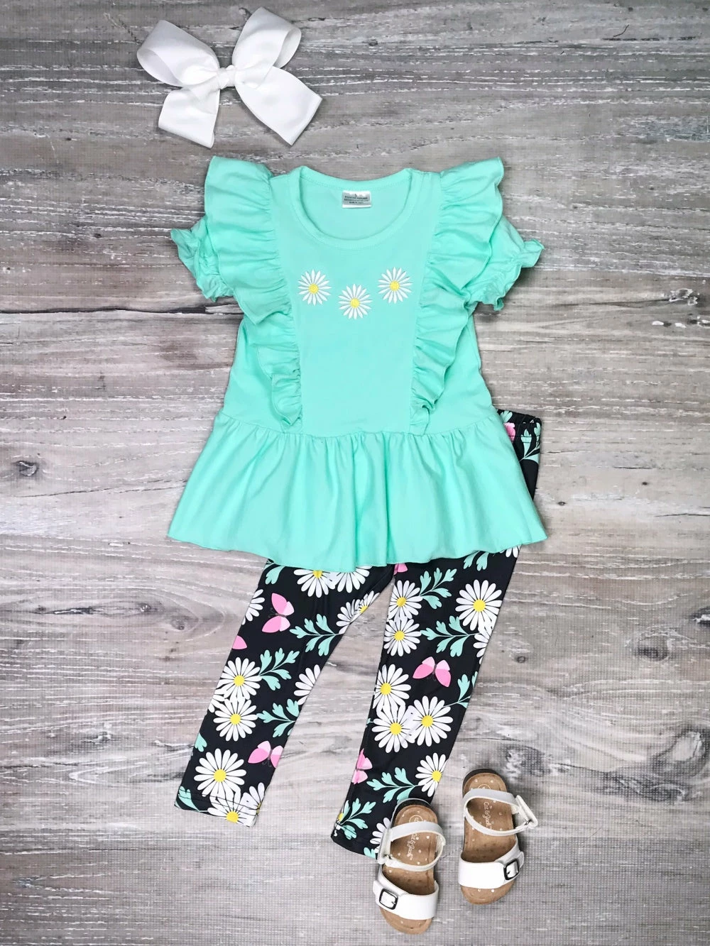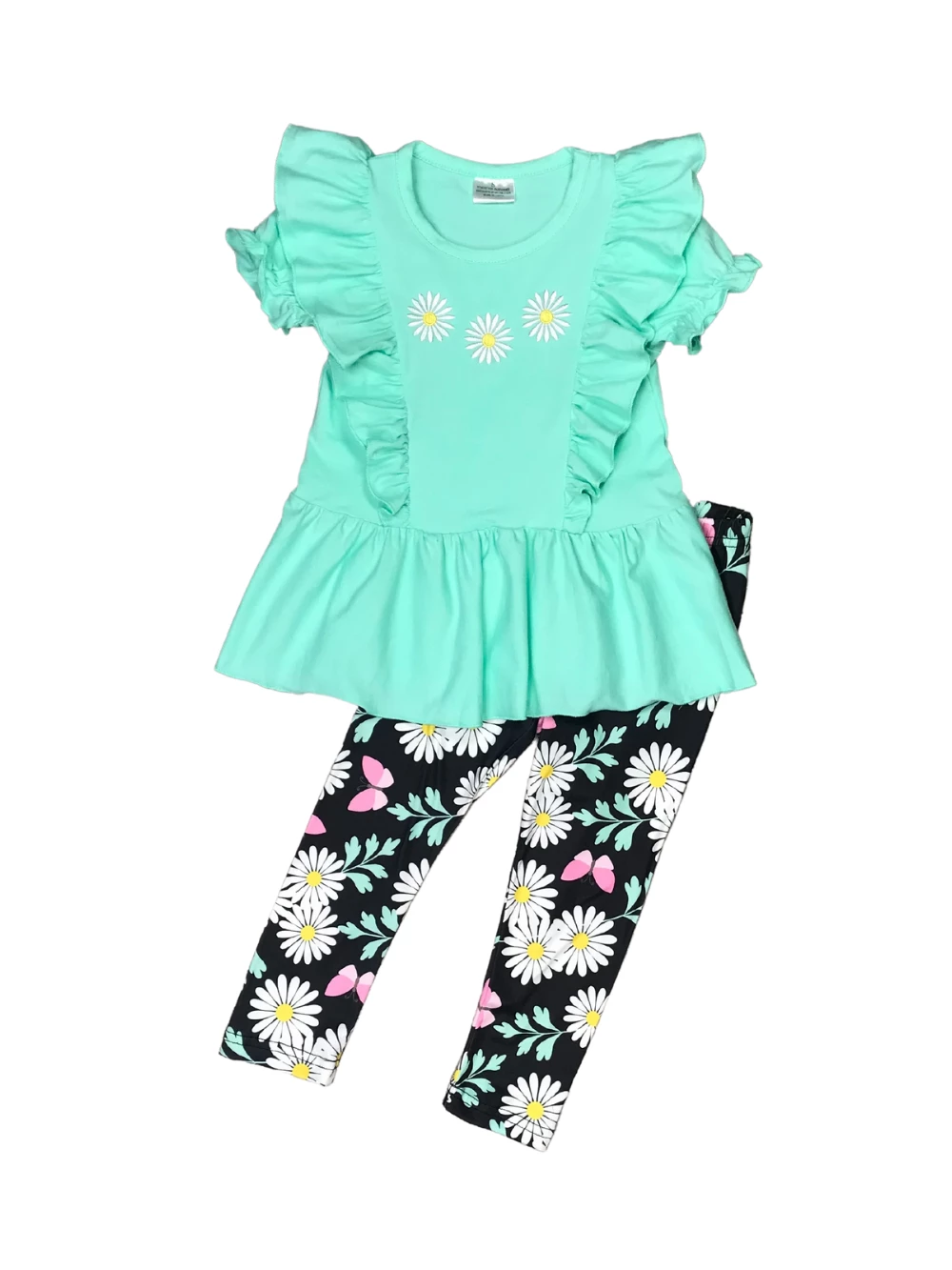 Spoil your little love bug with our Butterfly Kisses Daisy Blue Ruffle Flutter Girls Outfit! The set comes with a blue short sleeve top that features ruffle trim, flutter sleeves, and daisy details. The set also comes with a pair of navy blue leggings that feature a daisy butterfly pattern. We are loving this outfit with some sneakers or sandals and a coordinating blue hair bow. The butterfly themed outfit is perfect for school, running errands, playdates, parties, and so much more. Be sure to pickup this stylish set for your little cutie while her size is still in stock and checkout our other fashionable outfits.