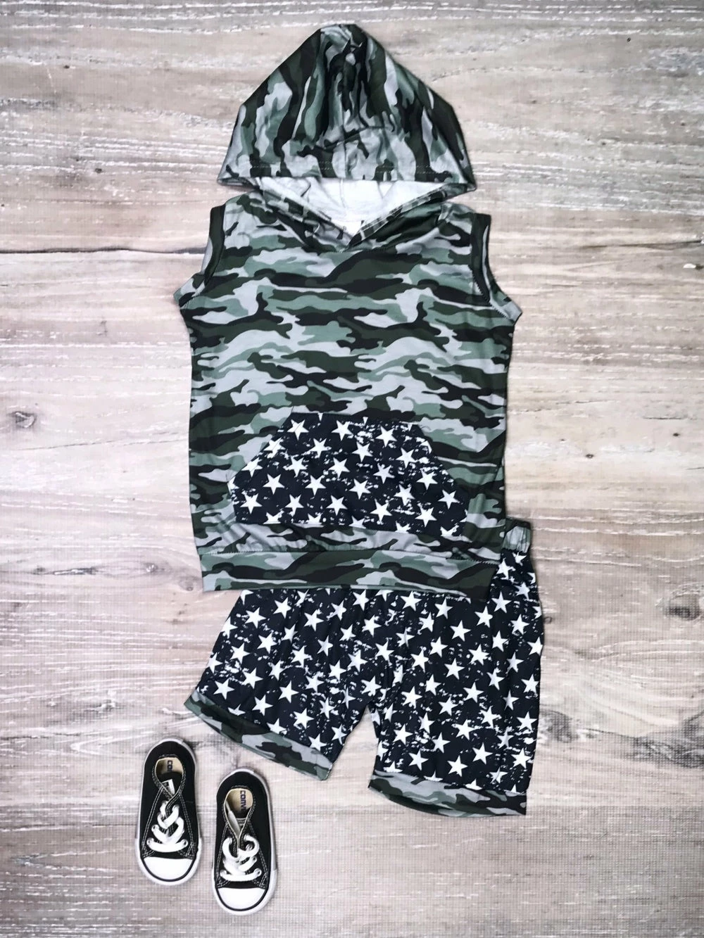 Keep it cool and casual in our Camo Cool Dude Navy Star Hooded Tank Boys Shorts Outfit! The staple set comes with a sleeveless top that features a green camouflage pattern, a star patterned pocket, and a hood. The set also comes with a pair of coordinating shorts that feature a star pattern, camouflage pattern, and elastic waistband. We are loving this shorts set with some sneakers and a cool pair of retro sunnies. The set is perfect for running errands, vacations, playdates, school, and so much more! Add this must have set to his collection while it’s still in stock and be sure to checkout our other best selling patriotic outfits.