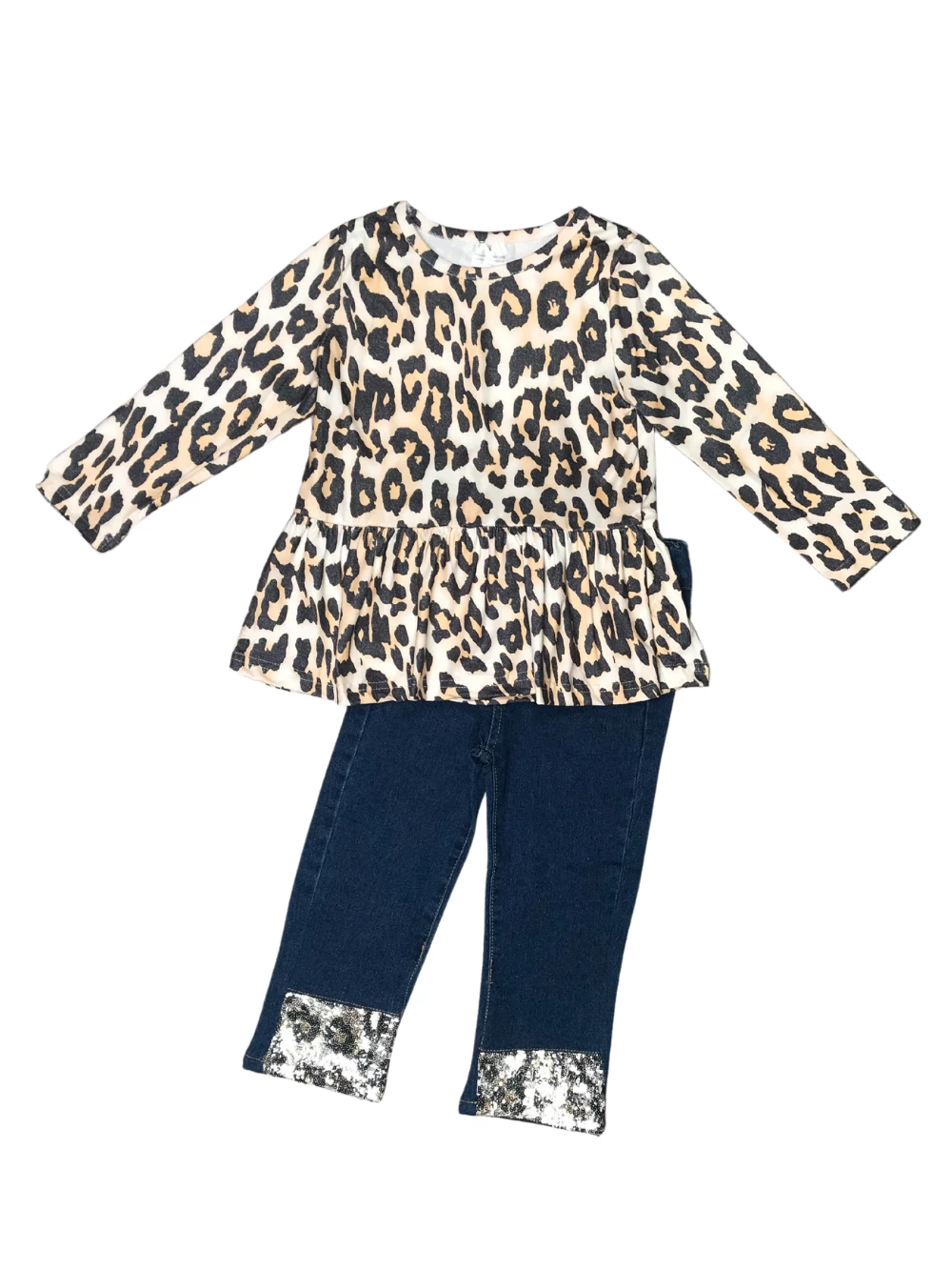 Look chic in cheetah with our fashion forward Charming Cheetah Babydoll Top Denim Cuffed Girls Outfit! The super sassy set comes with a long sleeve babydoll style top that features a cheetah pattern and ruffle trim along the bottom. The set also comes with a pair of denim jeans that feature cheetah patches along the bottom. We are loving this sassy set with some booties and a coordinating hair bow. The outfit is perfect for parties, school, playdates, shopping trips, and so much more! Pick up this outfit while her size is still in stock and be sure to checkout our other best sellers!