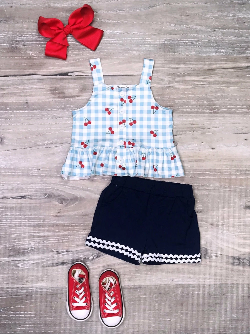 Complete her summer style with our Cherry On Top Blue Gingham Peplum Tank Girls Shorts Outfit! The set comes with a sleeveless peplum top that features a blue gingham cherry pattern, buttons, and ruffle trim. The set also comes with a pair of coordinating blue shorts that feature an elastic waistband and white trim. We are loving this outfit with some sneakers or sandals and a coordinating hair bow. The set is perfect for picnics, parties, running errands, shopping trips, and so much more. Pick up this outfit for your little cutie and be sure to checkout our other must have sets.