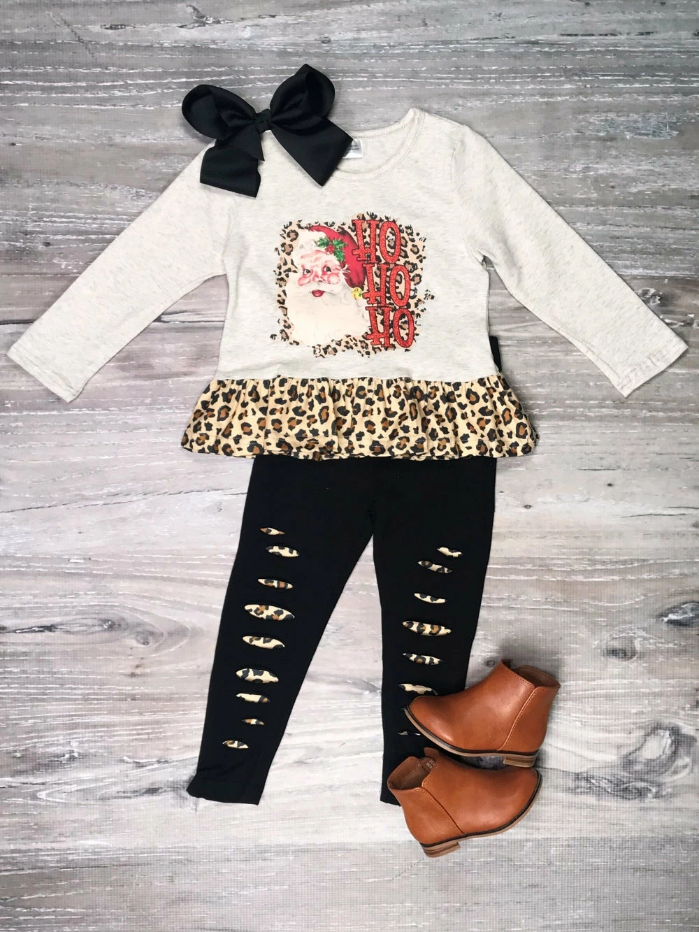 Embrace the holiday season with our trend setting Dear Santa Ho Ho Ho Leopard Distressed Leggings Girls Outfit! The stylish set comes with a long sleeve top that features a Santa Claus detail, the phrase “Ho Ho Ho,” and a leopard patterned ruffle bottom. The set also comes with a pair of coordinating black leggings that feature leopard patterned patches and distressed detailing. We are loving this outfit with some booties or sneakers and a coordinating hair bow. The set is perfect for holiday parties, playdates, school, running errands, trips to see Santa, and so much more. Pick up this set while it’s still in stock and be sure to checkout out other best selling holiday outfits!