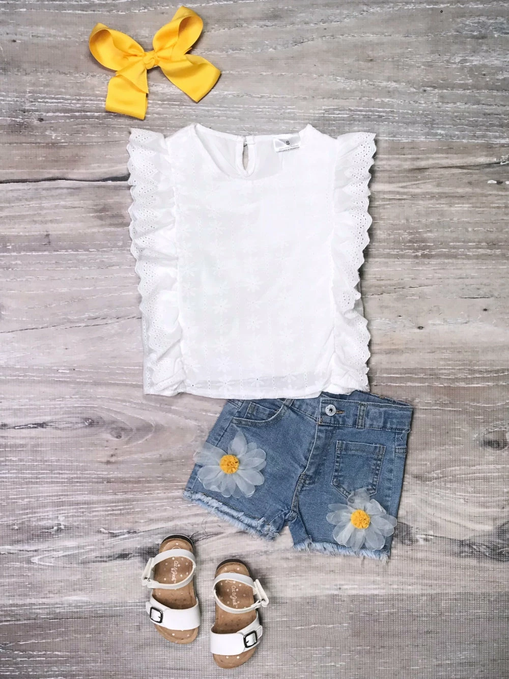 Don’t miss out on our Dollop Of Daisy White Ruffle Denim Girls Shorts Outfit! The outfit comes with a classic white sleeveless top features ruffles detailing and a keyhole cutout in the back. The set also comes with a pair of coordinating denim shorts that feature daisy details, distressed detailing, and an adjustable elastic waistband. We are loving this outfit with some sneakers or sandals and a coordinating yellow hair bow. The floral denim outfit is perfect for vacations, parties, playdates, running errands, and so much more. Pick up this outfit while it’s still in stock and be sure to checkout our other must have sets.