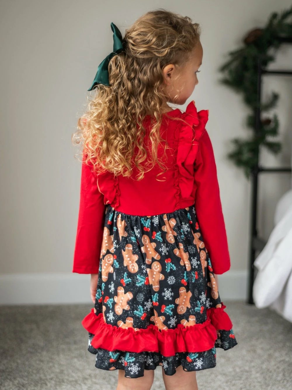 Get into the baking spirit with our delightful Baking Spirits Bright Gingerbread Red Ruffle Girls Christmas Dress! The adorable red long sleeve dress features a scrumptious gingerbread pattern, ruffle detailing, buttons, and red trim. We are loving this dress with some white knee high socks, brown booties, and a large red hair bow. We are loving this stylish dress for baking days, running errands, shopping trips, holiday parties, and so much more! Pick up this dress while your little’s size is still available and be sure to checkout our other best selling holiday pieces.