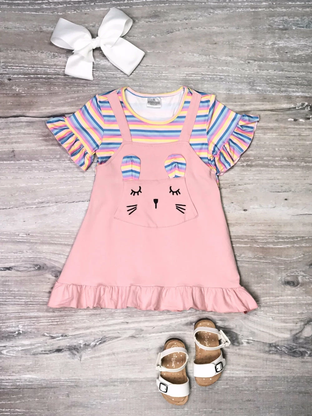 Hop along this Easter with our Bunny Rainbow Vibes Stripe Pink Ruffle Girls Easter Jumper Dress! The set comes with a short sleeve top that features a rainbow striped pattern and ruffle trim. The set also comes with a coordinating pink tank dress that features a bunny face detail and ruffle trim. We are loving this outfit with some sandals for a dressy look or some sneakers for a more laid back fit. The outfit is perfect for school, playdates, running errands, parties, playdates, and so much more. Pick up this dress set for your little bunny babe and be sure to check out our other must have Easter themed dresses and sets.