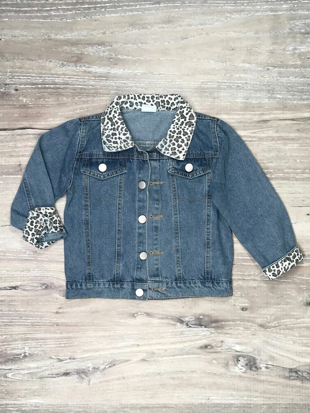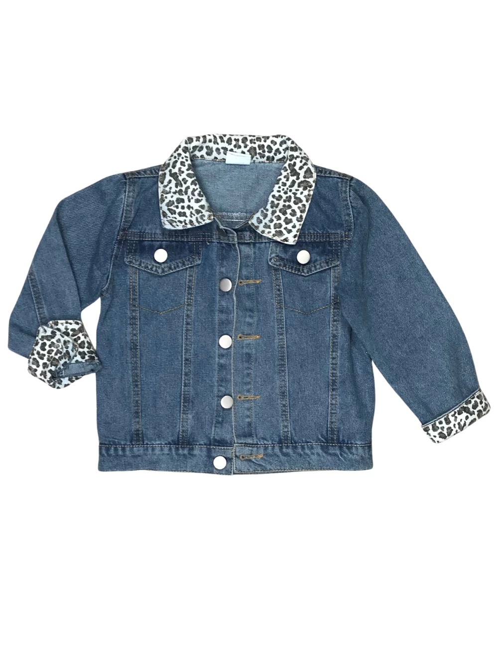 Cheetah girls get chilly, too! Warm her up with our stylish and sassy Cheetah Girl Cuffed Girls Denim Jean Jacket! The staple medium wash denim jacket features a cheetah pattern along the collar and inside of sleeves for that extra little girly detail. The jacket also features buttons and faux pockets to give it that authentic look. We are loving this jacket with dresses, bell bottom outfits, lounge sets, and so much more. The jacket is perfect for running errands, football games, trips to the zoo, shopping trips, and so much more! Pick up this jacket for your little fashionista and checkout our other cheetah-licious outfits!Â