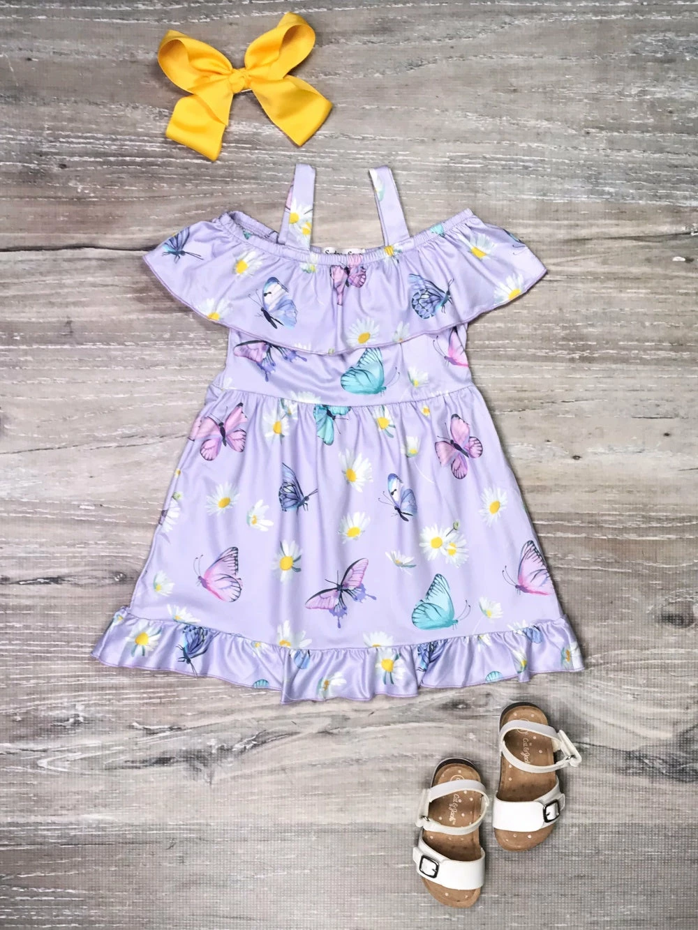 Fly into warmer weather with our magical Lavender Butterfly Floral Garden Cold Shoulder Ruffle Girls Dress! The purple dress features a butterfly floral pattern, ruffle overlay, cold shoulder cut, and spaghetti straps. We are just loving the floral butterfly pattern as it is so perfect for spring and summer. The dress is perfect for running errands, parties, playdates, vacations, shopping trips, and so much more. Just pair the dress with some sandals and a hair bow and she’ll be ready to go. Pick up this adorable dress for your little cutie and be sure to checkout our other must have dresses.