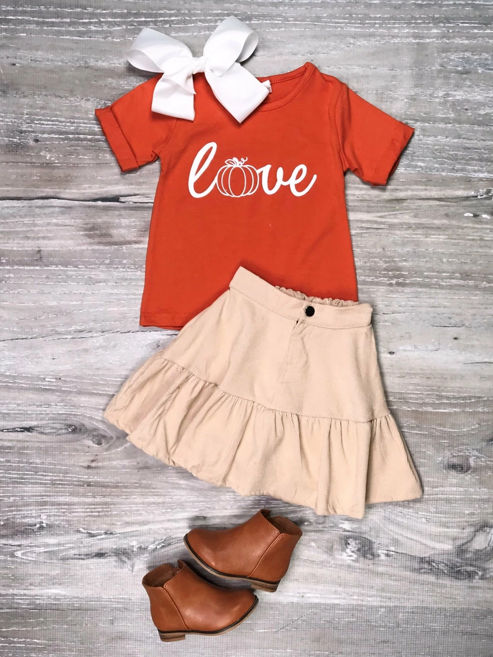 Display your little pumpkin’s sense of style with our Lil’ Pumpkin Love Short Sleeve Girls Corduroy Peplum Skirt Outfit! The adorable set comes with an orange short sleeve shirt that features the word “Love” and a pumpkin detail. The set also comes with a coordinating beige corduroy skirt that features ruffle trim, a button, and an elastic waistband. We just love how both pieces can be mixed and matched with items that she already has in her wardrobe. The set is perfect for school, trips to the pumpkin patch, shopping trips, and so much more. Just pair the set with some boots and a hair bow and she’ll be ready to go! Make sure that you checkout our other fashionable skirt outfits.