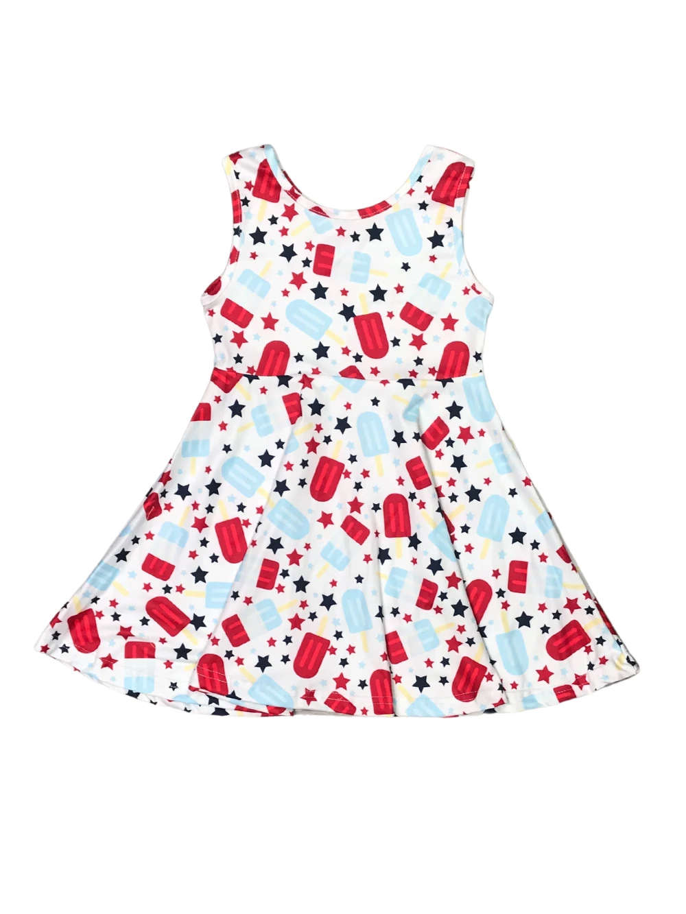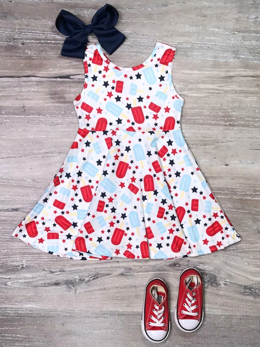 Sweeten up your all American girl’s wardrobe with our Patriotic Popsicle Red & Blue Tank Girls Skater Dress! The sleeveless skater dress features a patriotic popsicle pattern, a scoop neckline, and cinched waist. We are loving how you can dress this down with some classic white sneakers or you can dress it up with some sandals and a coordinating patriotic hair bow. The dress is perfect for picnics, family parties, vacations, playdates, watching fireworks, and so much more. Pick up this dress for your little and be sure to checkout our other patriotic best sellers.Â
