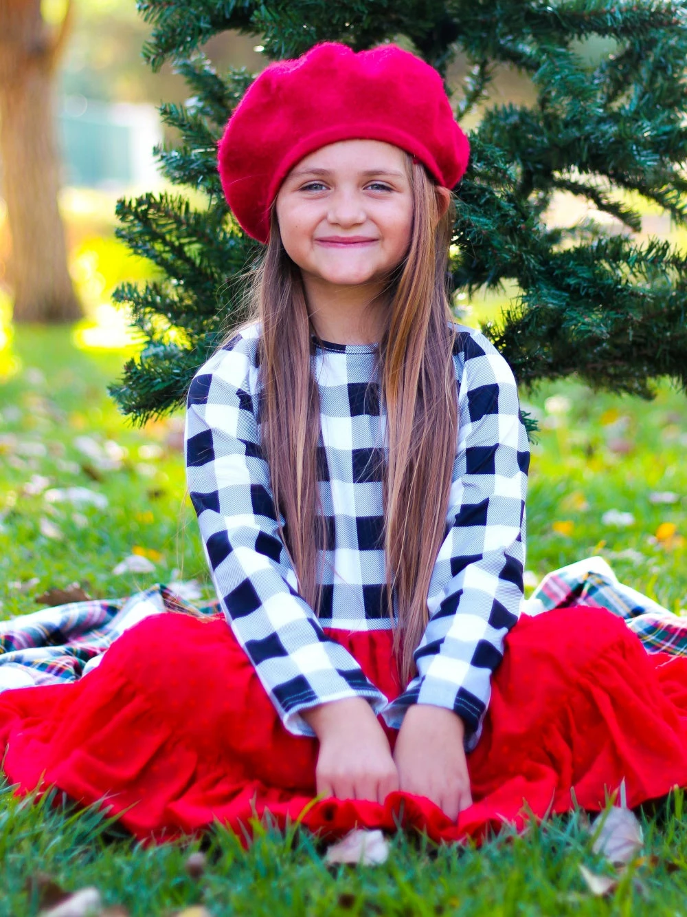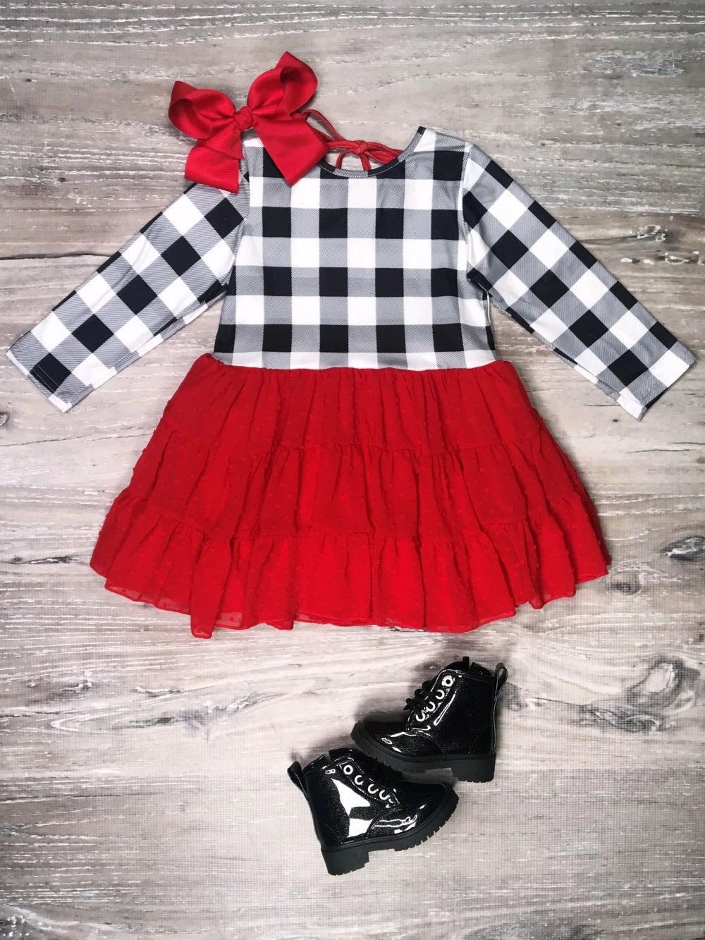 Girly up her dress collection with our fashionable and fabulous White Buffalo Plaid Red Swiss Dot Chiffon Girls Tutu Dress! The long sleeve dress features a black and white buffalo plaid pattern, a red swiss dot detailed tutu bottom, and a tie detail along the back. We are loving this enchanting winter dress with some white tights, black booties, and a coordinating large red hair bow. The dress is perfect for holiday parties, playdates, school, family photos, running errands, and so much more! Pick up this dress just in time for those upcoming holiday parties and events and be sure to checkout our other must have dresses!