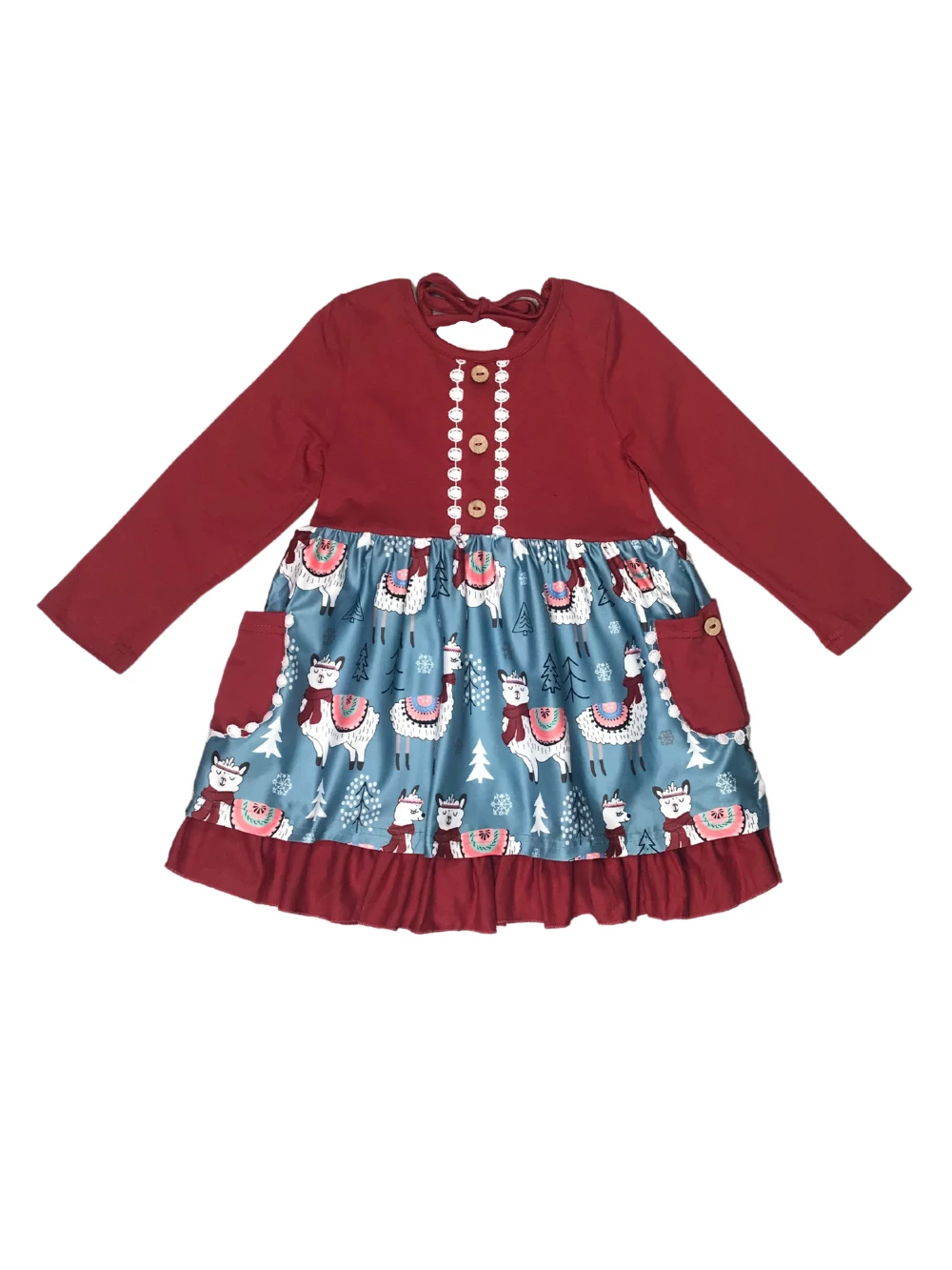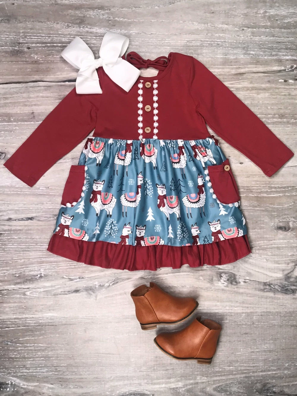Get your little llama ready for colder weather with our Winter Ooo La Llama Burgundy Blue Ruffle Girls Dress! The burgundy long sleeve dress features a blue llama pattern, pockets, buttons, and a tie detail in the back. Isn’t the llama pattern just the cutest pattern that you’ve ever seen!? We are loving this dress with some white knee high socks, brown booties, and a large coordinating burgundy or blue hair bow. The dress is perfect for running errands, shopping trips, parties, school, playdates, and so much more! Make sure that you snag up this dress while her size is still in stock and be sure to checkout our other best selling dresses!