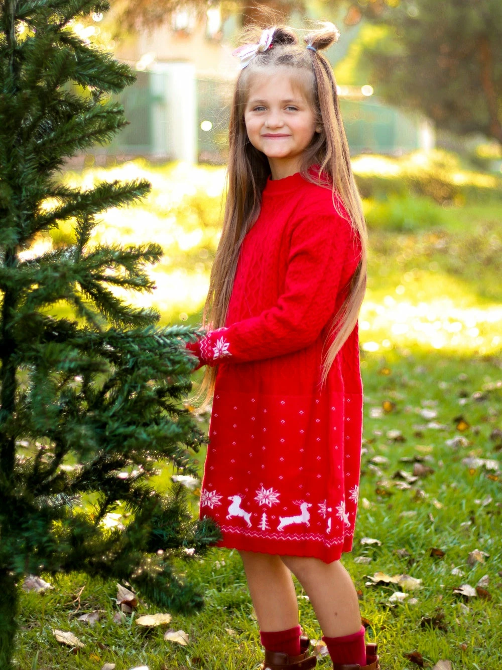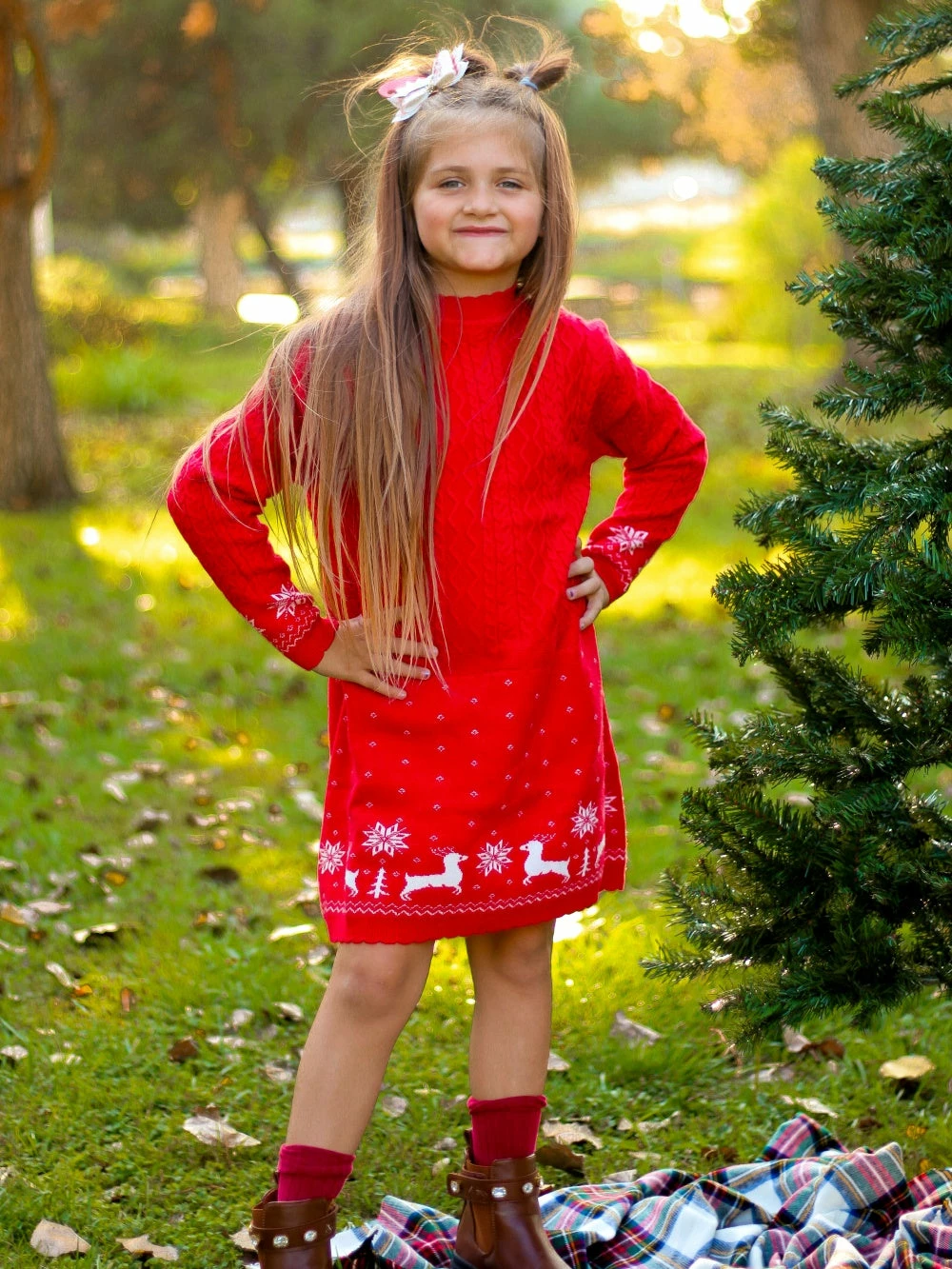 Get your little ready for sweater weather with our trendy Fair Isle Red Snowflake Cable Knit Girls Sweater Dress! The red long sleeve cable knit sweater dress features a classic fair isle snowflake pattern as well as a scalloped neckline. We are loving this staple dress with some white tights, brown booties, and a large red hair bow. The dress is perfect for holiday parties, Christmas card photoshoots, running errands, school, trips to see Santa, and so much more! Pick up this dress for her holiday wardrobe and be sure to checkout our other must have holiday pieces!