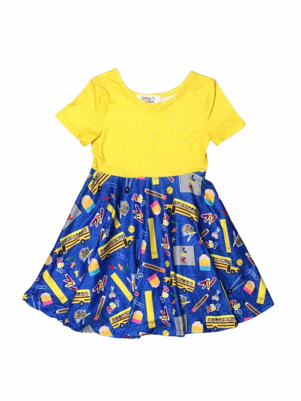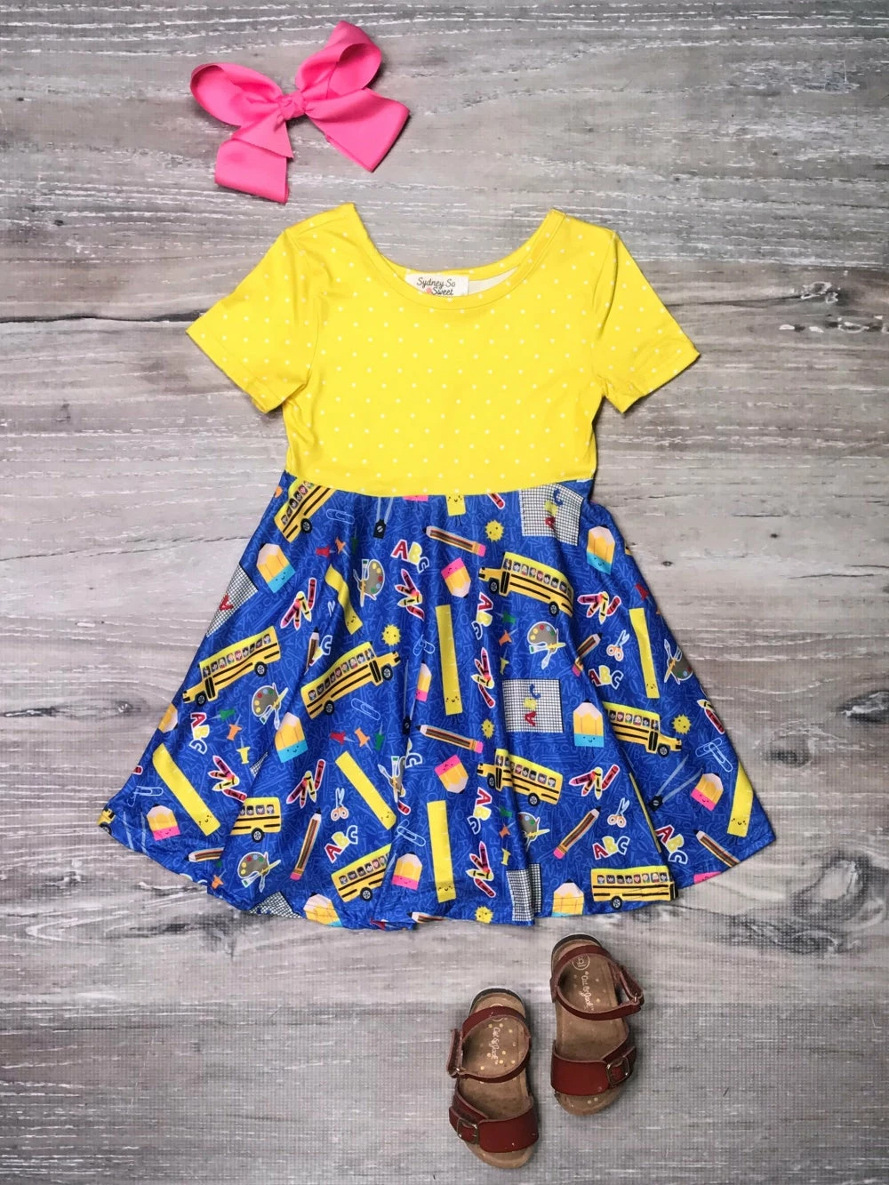 Express her love for school with our First Day Of School Bus & Supplies Yellow Skater Girls Back To School Dress! This short sleeve skater dress features a yellow top with white polka dots and a blue skirt bottom with a faint alphabet design covered by a multitude of school supplies and school buses. We are loving this fun dress with some white sneakers and a matching blue hair bow. This dress is perfect for the first day of school to help her make a bold but fun fashion statement. Pick up this dress now and be sure to checkout our other back to school favorites.