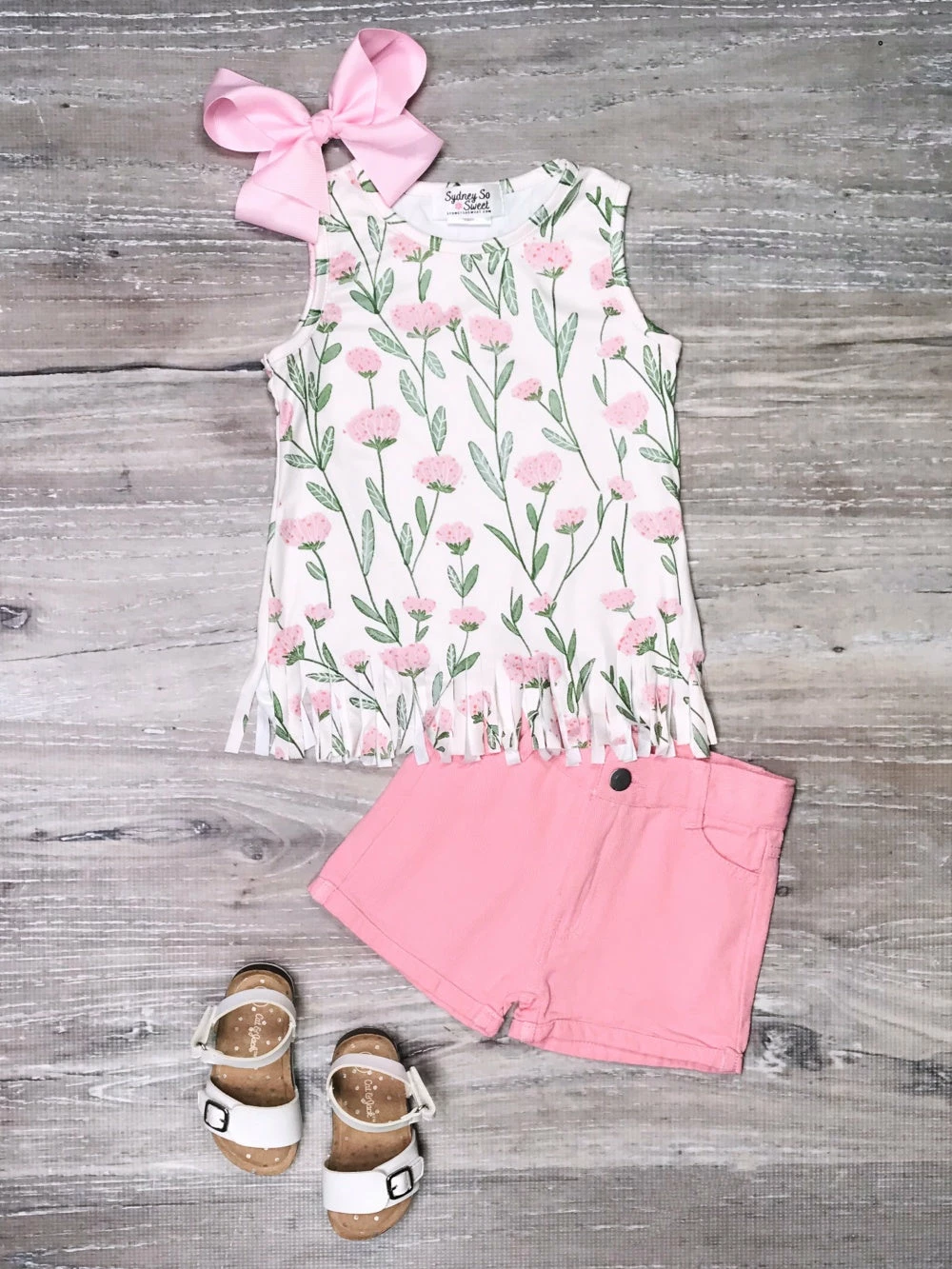 Give off that effortless look with our fabulous Floral Breeze Blush Pink & Green Denim Girls Shorts Outfit! The stylish set comes with a sleeveless top that features a pink and green floral pattern as well as fringe detailing along the bottom. The set also comes with a pair of coordinating pink denim shorts that featured cuffed bottoms and an adjustable elastic waistband. Don’t you love how both pieces can be mixed and matched with items that she already has in her collection?! The outfit is perfect for vacations, running errands, parties, playdates, and so much more. Just pair this outfit with some sandals and a hair bow and she’ll be ready to conquer the day. Don’t forget to checkout our other must have outfits.