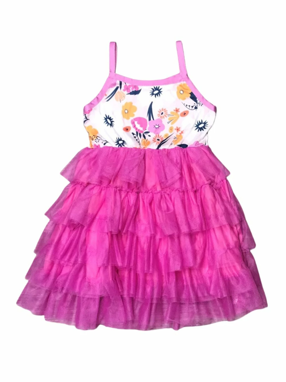 Be bold and show off her fun side in our Fuchsia Floral Tiered Chiffon Tulle Ruffle Girls Dress! The fuchsia pink sleeveless dress features an pink, yellow, and green floral pattern, pink trim, and ruffled fuchsia chiffon tulle trim. We are obsessing over this fabulous dress with some white sandals and a simple white hair bow to really show off the dress. This dress is perfect for shopping days, photoshoots, playdates, and so much more. Pick up this fashionable dress for your little diva and be sure to checkout our other trend setting dresses.