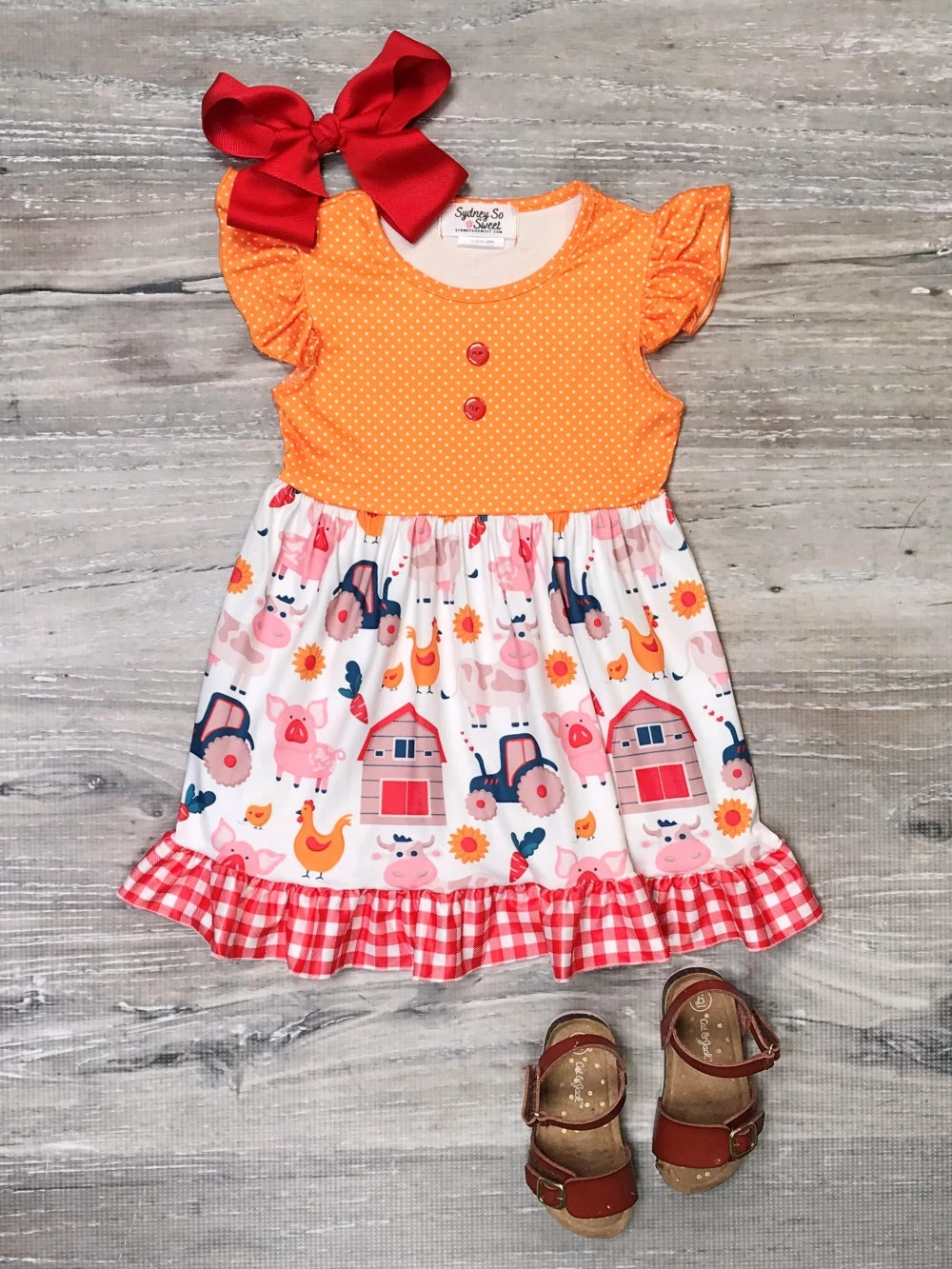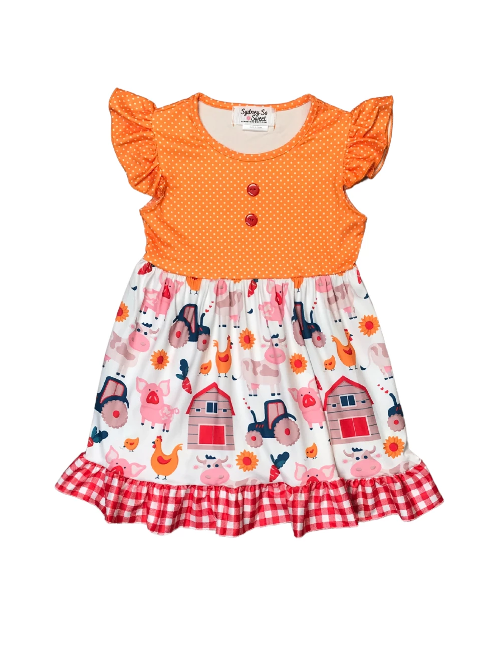 Look pretty in our adorable Gone Country Gingham Red & Orange Flutter Girls Dress! The super cute orange short sleeve dress features a red gingham pattern along the bottom, flutter sleeves, watercolor chickens, ruffle trim, and buttons. The darling dress is perfect for school, hanging on the farm, running errands, picnics, and so much more. Just pair the darling dress with some sneakers or sandals and a coordinating hair bow and your little will be ready to take on the day. Pick up this fashionable dress and be sure to checkout our other best selling dresses and outfits.
