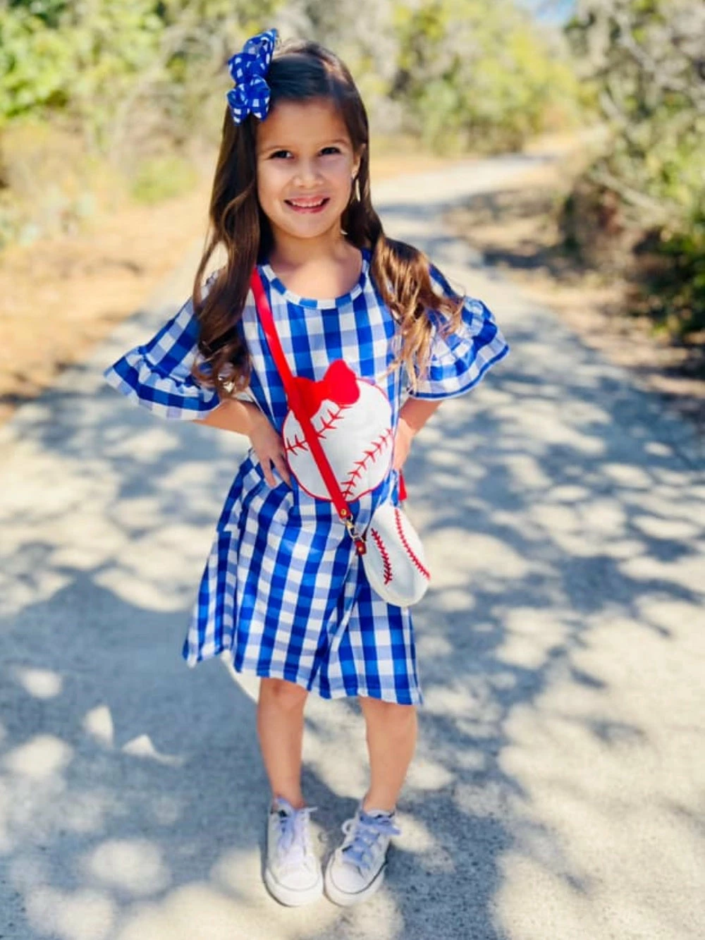 Hit the grand slam and pickup our Grand Slam Gingham Blue Baseball Girls Dress & Purse Set! The adorable set comes with a short sleeve dress that features a blue gingham pattern, a baseball detail, pockets, and ruffle trim. The set also comes with a coordinating baseball shaped purse. We are loving this dress with some classic white sneakers and a coordinating red hair bow. The dress set is perfect for school, baseball games, running errands, shopping trips, and so much more. Pick up this set while her size is still in stock and be sure to checkout our other must have dresses.