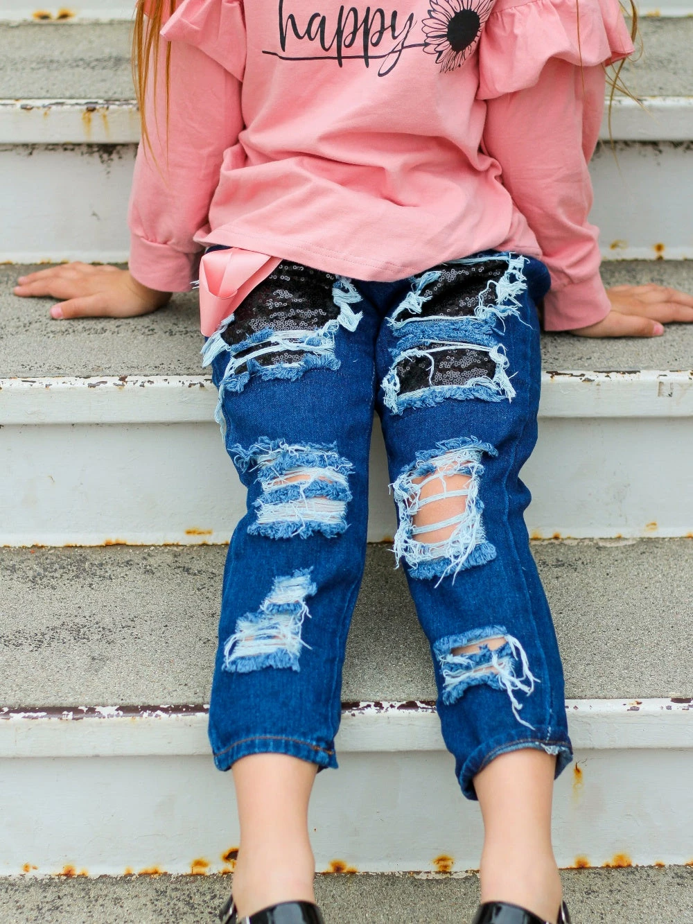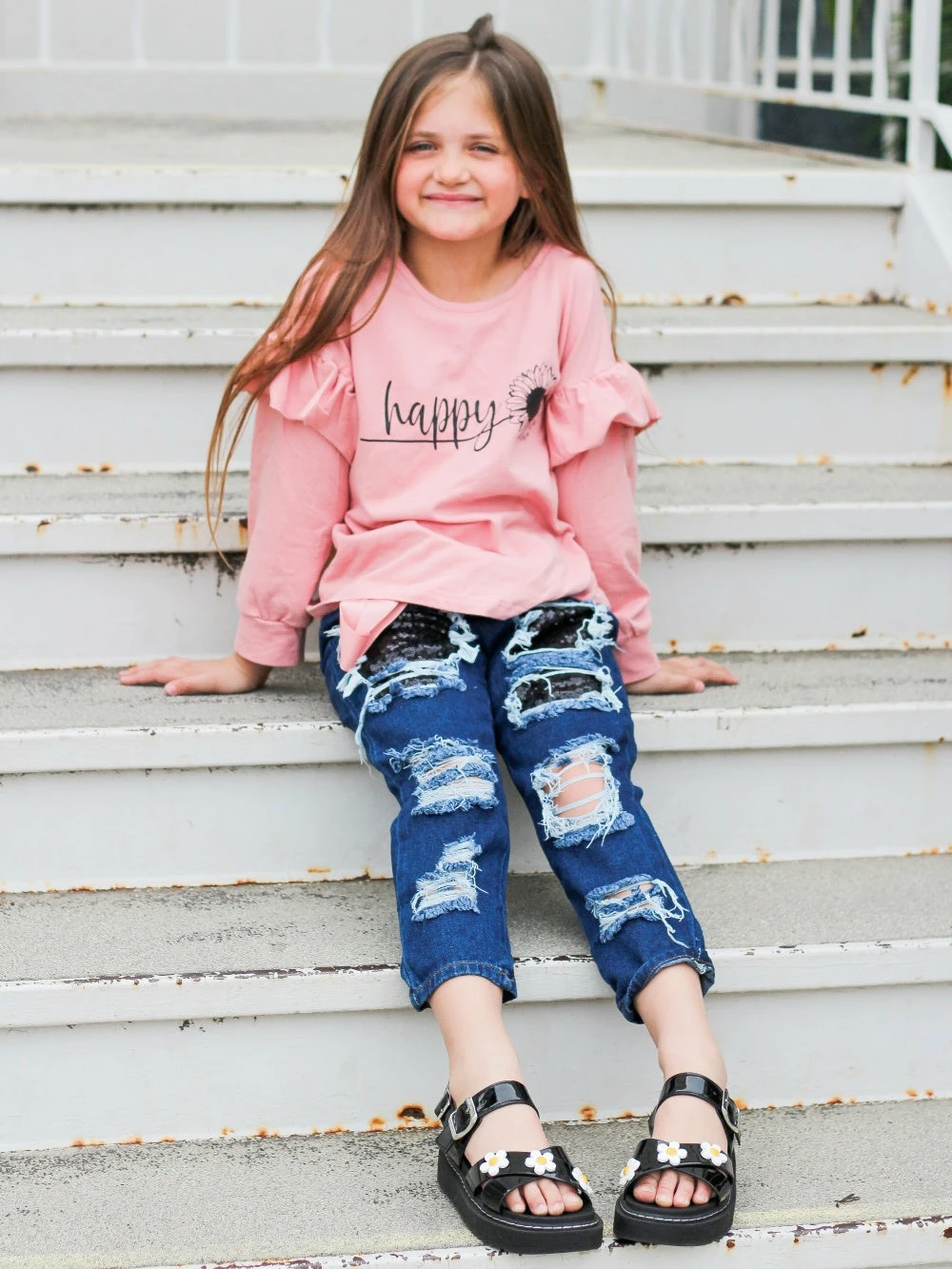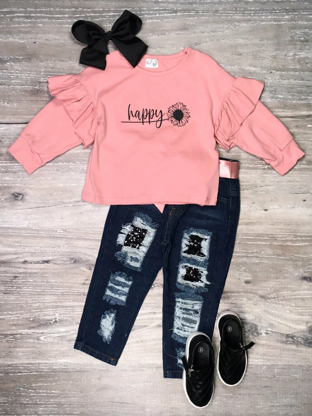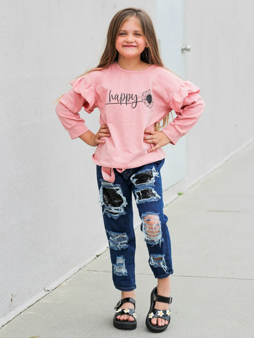 Shine bright like a sunflower in our Happy Sunflower Dusty Rose Sequin Denim Patch Ruffle Girls Outfit. The set comes with a dusty rose pink long sleeve top that features ruffle detailing along the shoulders. The set also comes with a pair of distressed denim jeans and a pink belt. We love this outfit with some booties and a coordinating pink hair bow. The set is perfect for school, shopping trips, parties, playdates, and so much more. Pick up this fashionable set while her size is still in stock and be sure to checkout our other best selling denim sets.