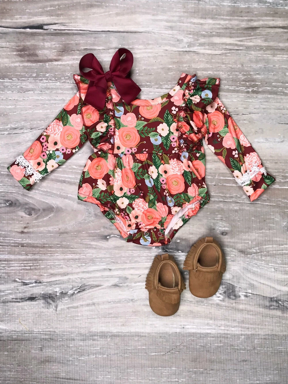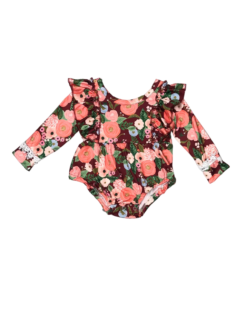 Get your littlest one ready for fall with our adorable Harvest Floral Ruffle Neck Fall Fashion Boutique Baby Romper! The long sleeve baby romper features a harvest floral pattern, ruffle detailing, and snaps along the bottom. We are loving the snaps along the bottom as they make for super quick and easy diaper changes. The romper is perfect for fall photos, running errands, events, shopping trips, and so much more. Just pair the romper with some white knee high socks, brown booties, and a hair bow. Pick up this romper for your little cutie and make sure that you checkout our other best selling baby rompers.