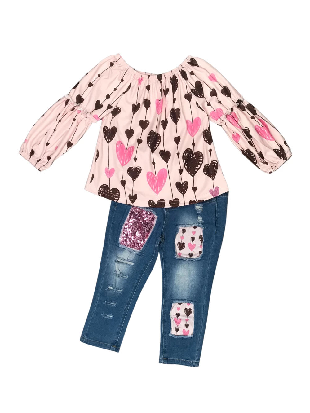 Your little one will be breaking hearts all over town with our Heart Breaker Sassy Sequin Pink & Brown Denim Patch Girls Outfit! The adorable set comes with a pink long sleeve top that features a heart pattern and cold shoulder cut. The set also comes with a pair of coordinating denim jeans that feature distressed detailing as well as coordinating heart patterned patches and a pink sequined patch. We are loving this outfit with some booties or sneakers and a matching pink hair bow. The set is perfect for school, parties, playdates, running errands, and so much more. Pick up this fabulous set and be sure to checkout our other heart themed favs.
