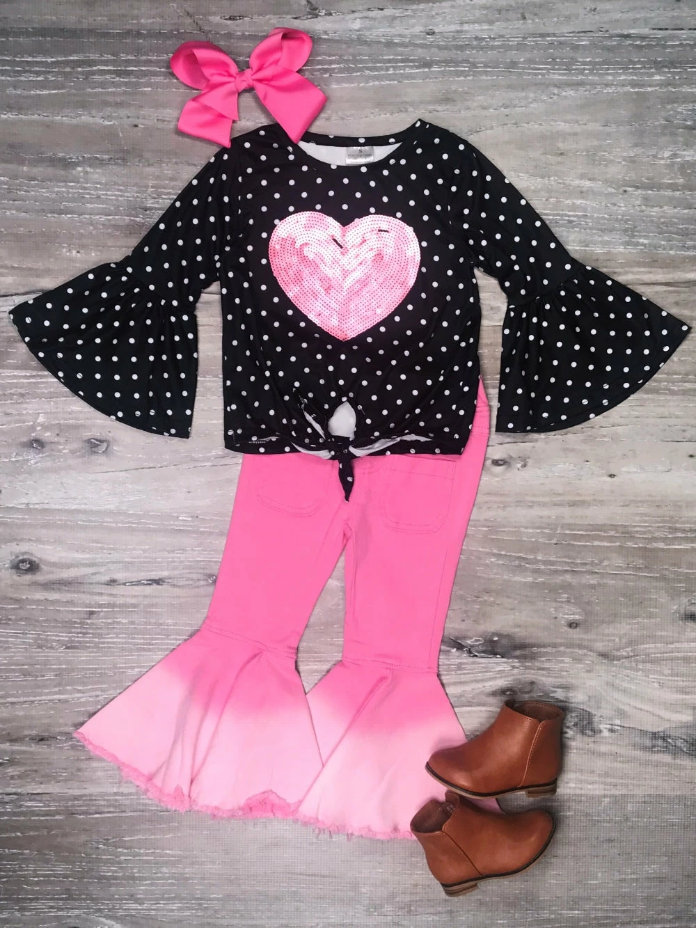 Add some flare to her sense of style with our Heart Skips A Beat Pink Sequin Ombre Flare Denim Girls Outfit! The set comes with a black long sleeve top that features a polka dot pattern, flare sleeves, a sequined heart detail, and tie bottom. The set also comes with a pair of matching pink ombre denim jeans that feature a flared out bottom as well as button details. We are loving this girly set with some sneakers or booties and a matching pink hair bow. The outfit is perfect for school, running errands, Valentine’s Day parties, playdates, and so much more. Pick up this set while you still can and be sure to checkout our other must have holiday sets.