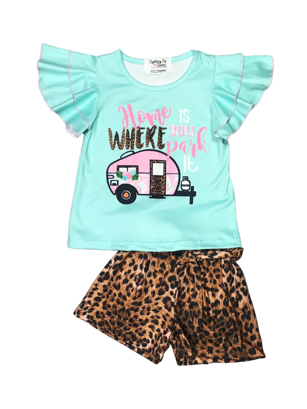 Embrace the traveling life with our adorable Home Is Where You Park It Blue Camper Cheetah Girls Shorts Outfit! The set comes with a blue short sleeve top that features the phrase “Home Is Where You Park It,” a girly camper detail, and flutter sleeves. The set also comes with a pair of coordinating shorts that feature a cheetah pattern and elastic waistband. We love how your little diva can mix and match both pieces with items that she already has in her collection. The outfit is perfect for road trips, vacations, running errands, playdates, and so much more. Just pair this sassy set with some sneakers and a hair bow and she’ll be ready to hit the road. Be sure to checkout our other best selling sets.