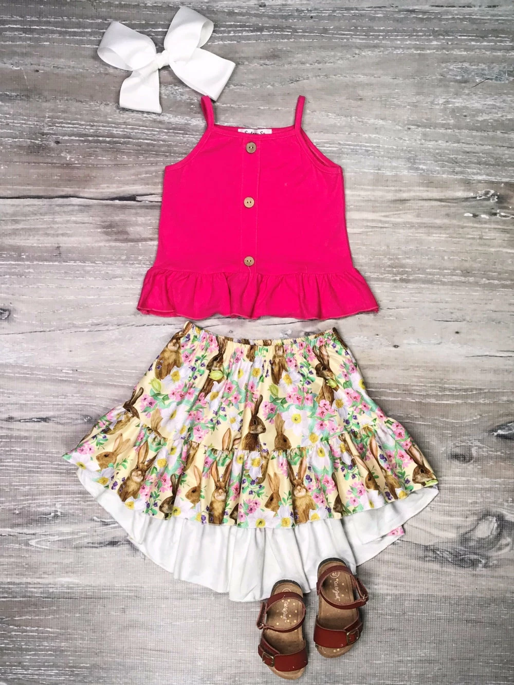 The hunt is over! Our Hoppin’ Hot Pink Rabbit Floral Hi Lo Girls Easter Skirt Outfit is the perfect Easter outfit for your little one! The adorable set comes with a hot pink tank top that features buttons and a ruffled bottom. The set also comes with a floral rabbit patterned elastic waist skirt that features a hi lo cut. We are loving this for Easter with a cute cardigan or jean jacket and then take it on into the summer with a pair of white sandals. Hop this one right on into your cart!