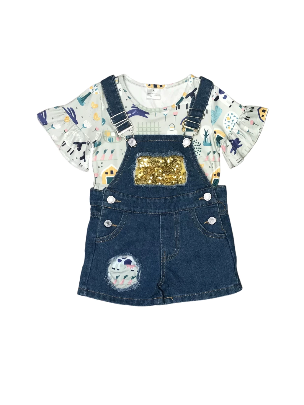 Hop around this spring with our Hopping Into Spring Bunny Golden Sequin Girls Denim Overalls Outfit! The hippity hopity set comes with a gray short sleeve top that features a bunny pattern and ruffle trim. The set also comes with a pair of stylish denim overall shorts that feature patches and distressed detailing. We are loving this fashionable outfit with some sneakers or sandals and a coordinating hair bow. The outfit is perfect for running errands, parties, playdates, egg hunts, and so much more. Pick up this darling outfit for your little bunny and be sure to checkout our other must have Easter themed outfits.