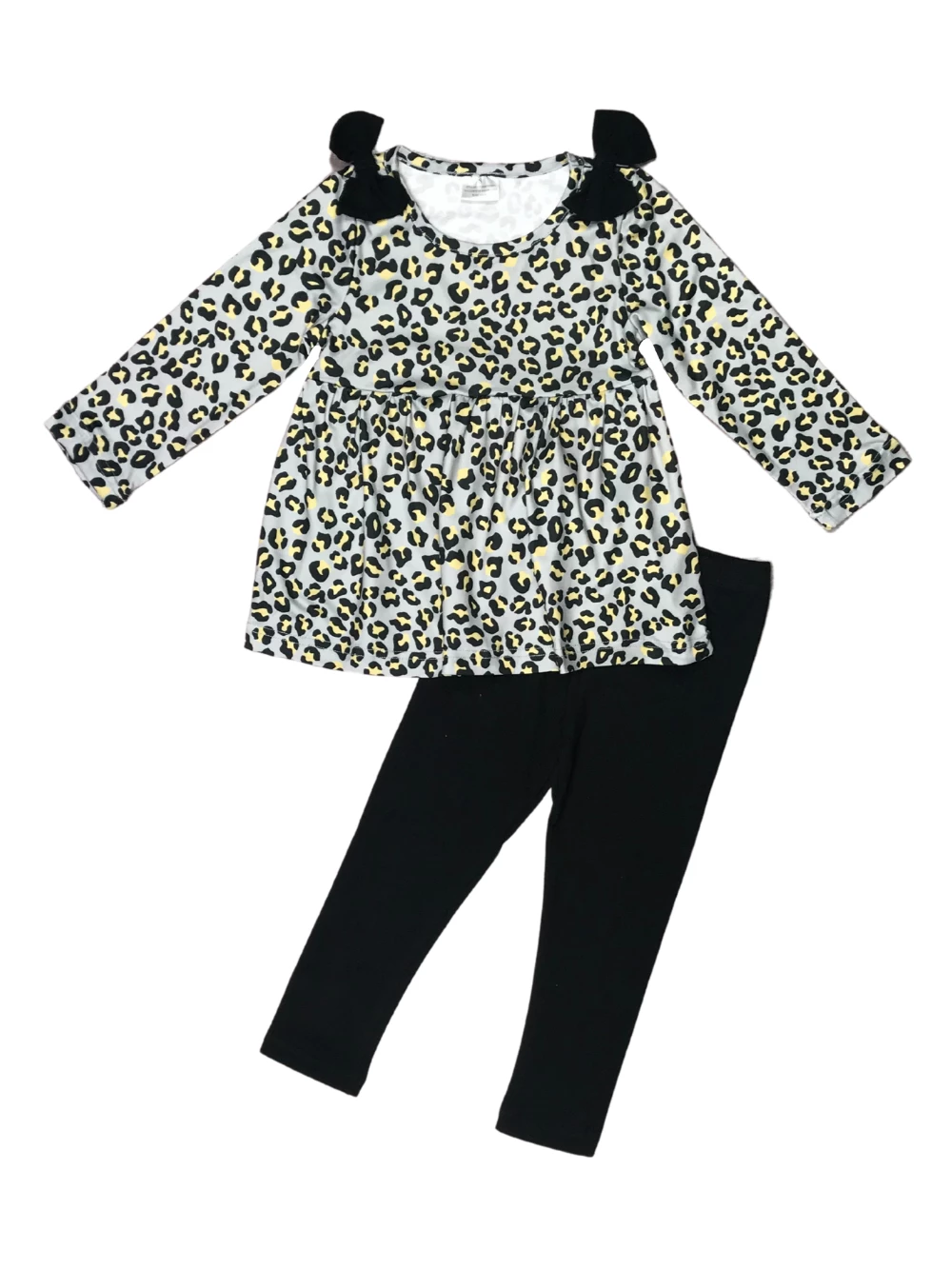 Show off that leopard love with our best selling Leopard Love Gray & Black Bow Girls Leggings Outfit! The set comes with a gray long sleeve top that features a black leopard pattern, ruffle detailing, and bow details along the shoulders. The set also comes with a pair of basic black leggings. We love how both items can be mixed and matched with pieces that she already has in her wardrobe! The set is perfect for school, parties, playdates, running errands, and so much more. Pick up this outfit while her size is still in stock and be sure to checkout our other best sellers.