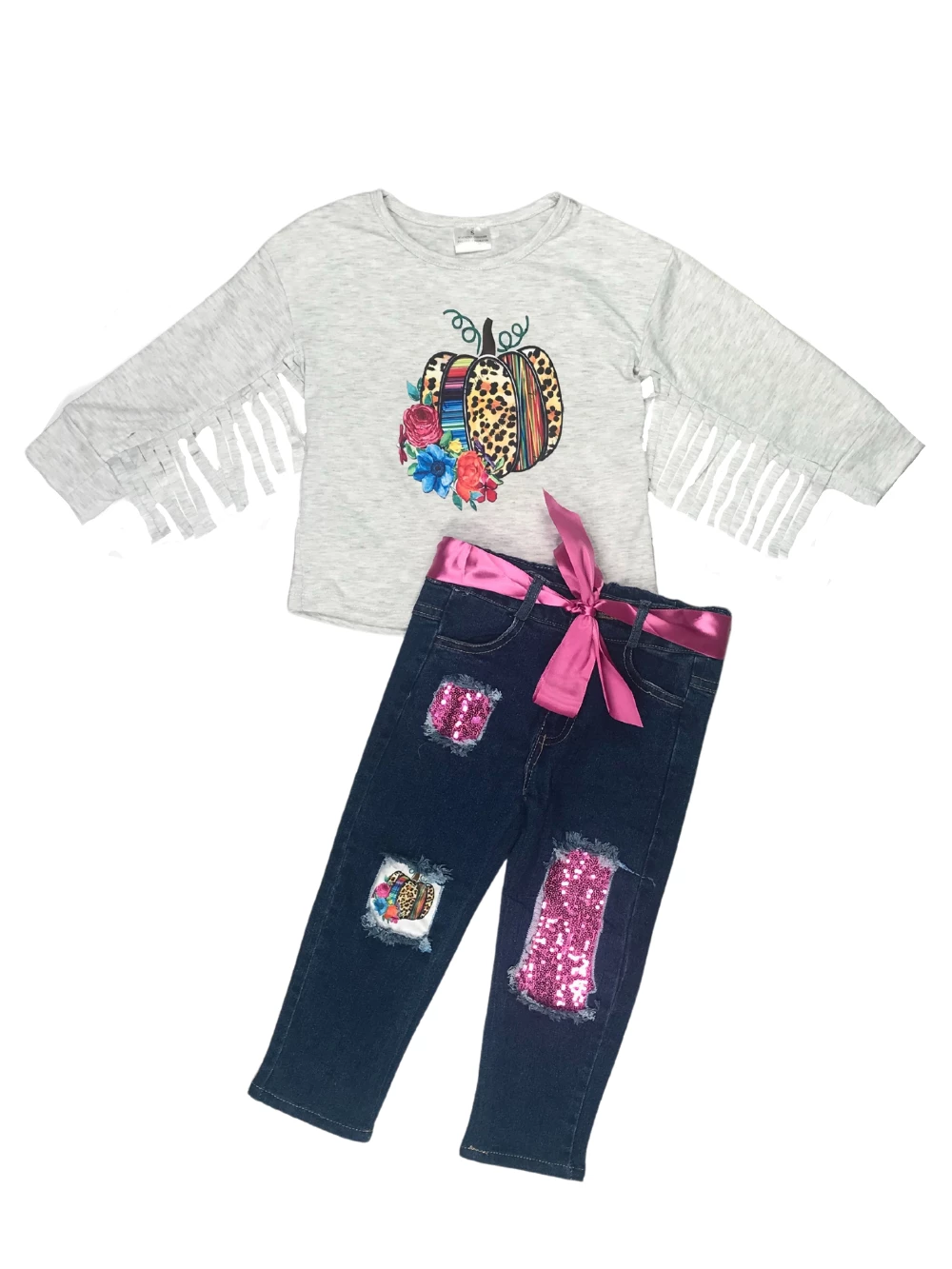 Add some sass to her fall wardrobe with our Light Heather Gray Pumpkin Serape Cheetah Fringe Fall Denim Girls Outfit! The set comes with a light gray long sleeve top that features a multi-patterned pumpkin detail and fringe trim along the sleeves. The set also comes with a pair of denim jeans that feature sequined patches and distressed detailing. The set also comes with a coordinating fuchsia satin tie belt. We are loving this stylish set with some booties and a cute hair bow. The outfit is perfect for playdates, trips to the pumpkin patch, and so much more! Pick up this outfit while it’s still available and checkout our other stylish fall fits.