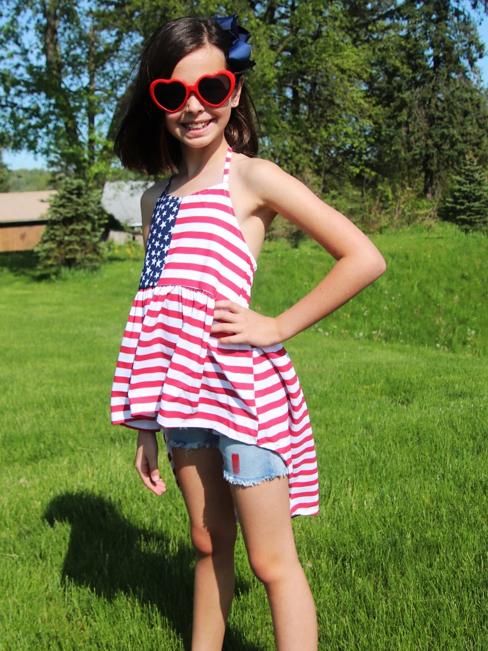 Treat your all American girl to our all American Little Miss America Star Hi Lo Tank Denim Girls 4th Of July Shorts Outfit! The set comes with a sleeveless top that features a stars a stripes pattern, hi lo cut, and halter style strap. The set also comes with a pair of coordinating denim shorts that feature American details, frayed bottoms, and an adjustable elastic waist detail. We are loving this fashionable set with some sneakers or sandals and a coordinating red hair bow. The shorts set is perfect for picnics, watching fireworks, playdates, and so much more. Pick up this must have outfit and be sure to look at our other patriotic sets.