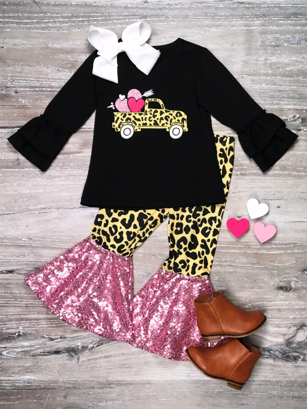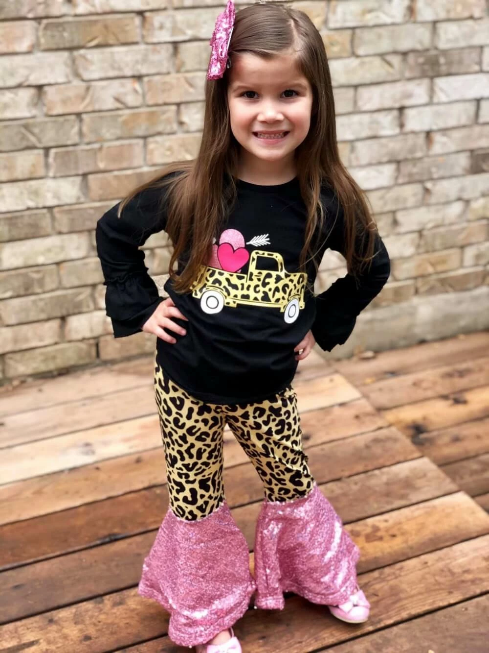 Take a trip to lover’s lane with our Loads Of Love Leopard Truck Pink Sequin Girls Bell Bottoms Outfit! The fabulous set comes with a black long sleeve top that features a leopard truck detail and ruffle trim. The set also comes with a pair of matching leopard patterned bell bottoms that feature pink sequins and an elastic waistband. We are loving this best selling set with some booties and a matching pink hair bow. The outfit is perfect for school, running errands, and so much more. Pick up this outfit and be sure to checkout our other must have seasonal sets.