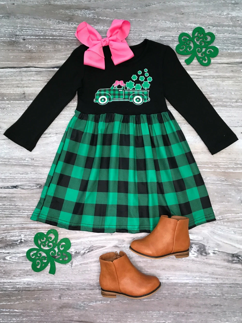 Drive up her luck with our super fun Loads Of Luck Truck Plaid Shamrock Girls St. Patrick’s Day Dress! The black long sleeve dress features a green plaid pattern and a plaid patterned St. Patrick’s Day truck detail. We are loving this dress with some white knee high socks, brown booties, and a coordinating green hair bow. The dress is perfect for school, parties, playdates, running errands, and so much more. Pick up this dress for your little good luck charm and be sure to checkout our other must have holiday themed outfits and dresses.