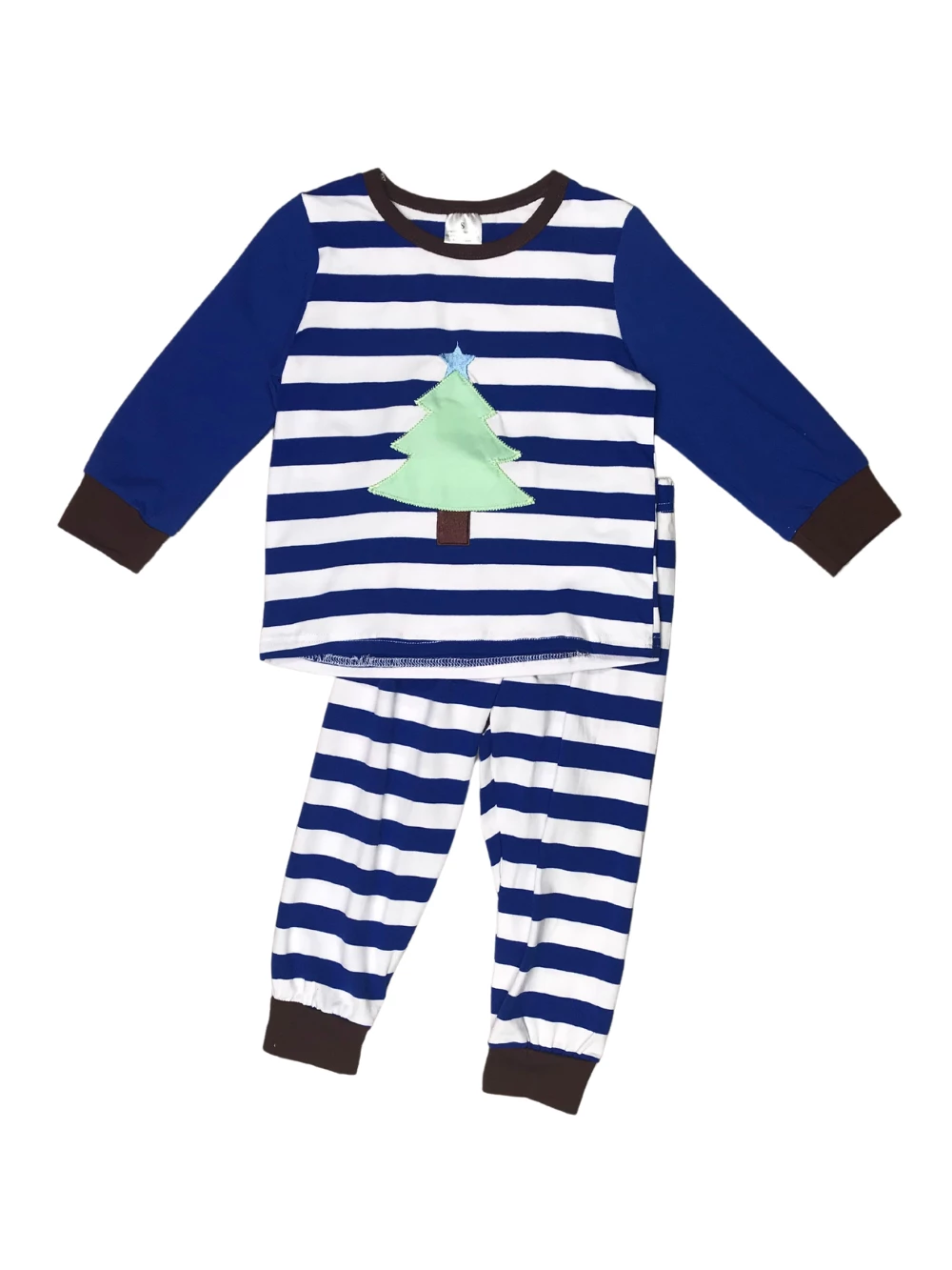 Get cozy this holiday season with our Blue Stripe Tree Stripe Kids Christmas Pajamas! The pajama set comes with a super cute long sleeve pajama top that features a blue and white striped pattern, blue sleeves, brown trim, and a Christmas tree detail. The set also comes with a pair of blue and white striped pajama pants that feature an elastic waistband and brown trim. We are loving this set with some slippers or fuzzy socks and a cozy blanket. The pajamas are perfect for movie nights, writing letters to Santa, lazy days, and so much more! Pick up this set for your little man while it’s still in stock and checkout our other best selling pj sets.
