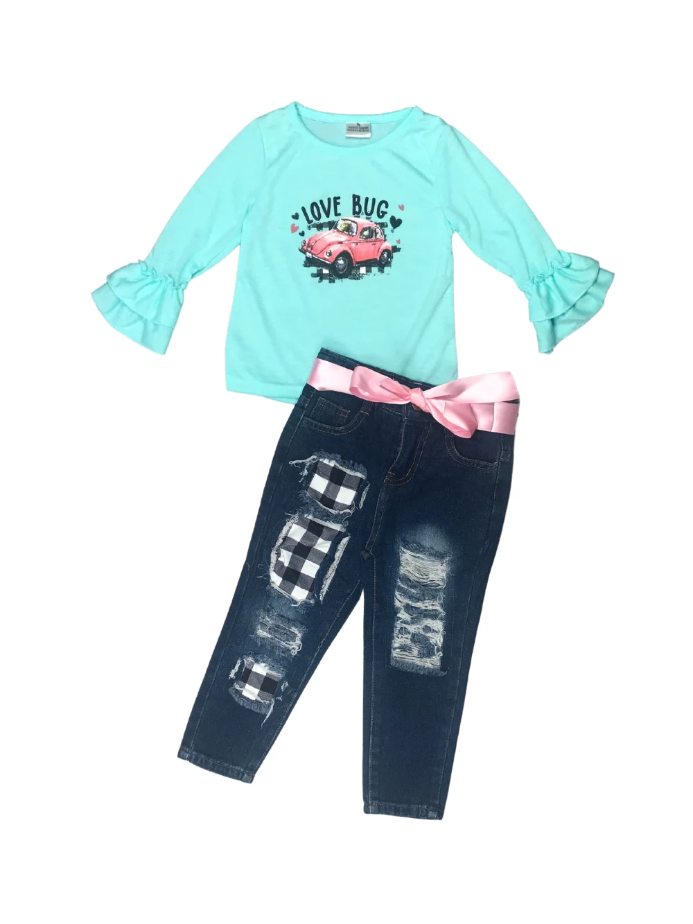 Spoil your little love bug with our absolutely adorable Love Bug Pink Buggie Plaid Denim Patch Girls Valentine’s Day Outfit! The set comes with a blue long sleeve top that features a pink car detail, the phrase “Love Bug,” and ruffle trim along the sleeves. The set also comes with a pair of denim jeans that feature distressed detailing and plaid patterned patches. Also included is a coordinating light pink satin tie belt. We are loving this outfit with some booties or sneakers and a matching pink hair bow. The set is perfect for school, running errands, Valentine’s Day parties, shopping trips, and so much more. Pick up this must have denim outfit and be sure to checkout our other essential Valentine’s themed sets.