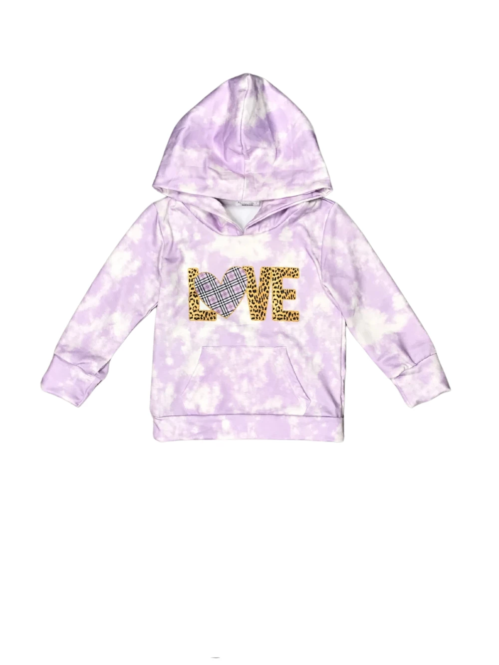 Put a little love in her wardrobe with our fashion forward Love Leopard Lavender Tie Dye Girls Hooded Sweatshirt! The trendy long sleeve sweatshirt features a purple tie dye pattern, the word “Love” in a leopard pattern, and a hood. We are loving this hoodie with some denim jeans, leggings, bell bottoms, or joggers. The sweatshirt is perfect for school, running errands, parties, playdates, lazy days at home, and so much more. Pick up this cozy must have while her size is still in stock and be sure to checkout our other cozy essentials and sets.