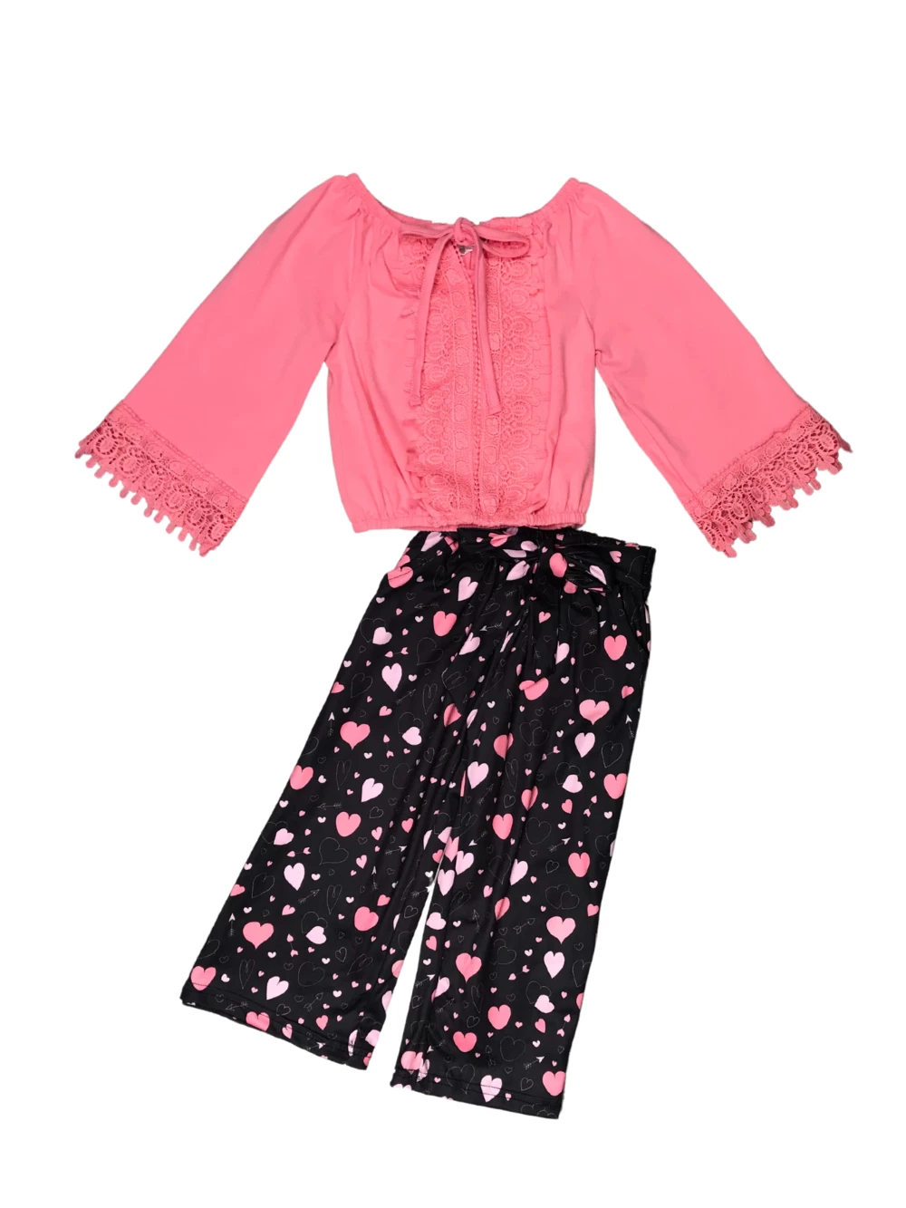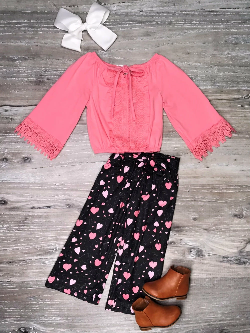 Keep the love going with our fashionable Love Never Fails Pink Polka Heart Wide Leg Girls Outfit! The set comes with a pink long sleeve top that features flare sleeves, a cold shoulder cut, a tie detail, and lace detailing. The set also comes with a pair of pants that feature a heart pattern, wide legs, and an elastic waistband. We are loving this fashionable outfit with some booties or sneakers and a matching pink hair bow. The outfit is perfect for school, running errands, Valentine’s Day parties, photoshoots, and so much more. Pick up this super cute set while it’s still in stock and be sure to checkout our other fashionable Valentine’s Day sets.