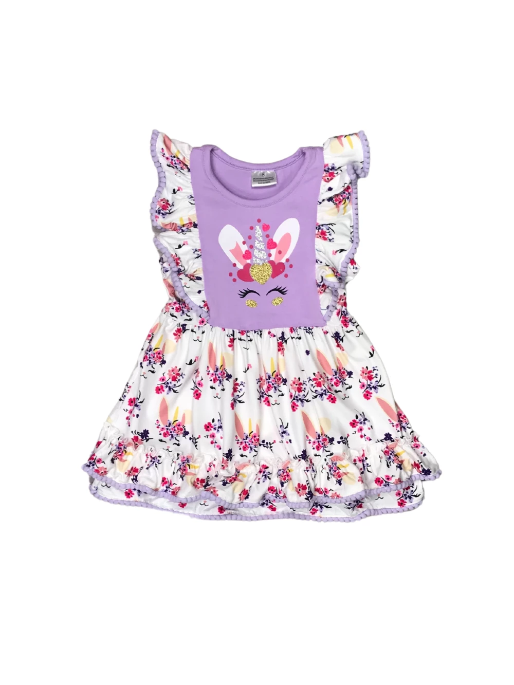 Sprinkle some magic into her day with our Magical Unicorn Bunny Love Purple Floral Girls Easter Dress! The purple sleeveless dress features a bunny unicorn detail, a coordinating pattern, and flutter sleeves. We are loving this super fun pattern as it is just so perfect for Easter. The dress is perfect for running errands, shopping trips, playdates, parties, egg hunts, and so much more. Just pair the dress with some sandals and a hair bow and your little bun will be ready for the day. Pick up this dress and be sure to checkout our other must have Easter dresses.