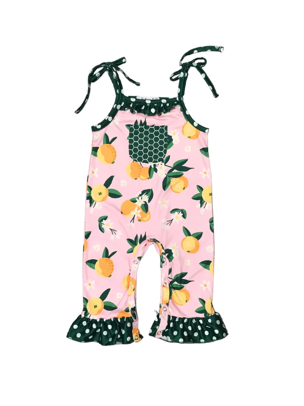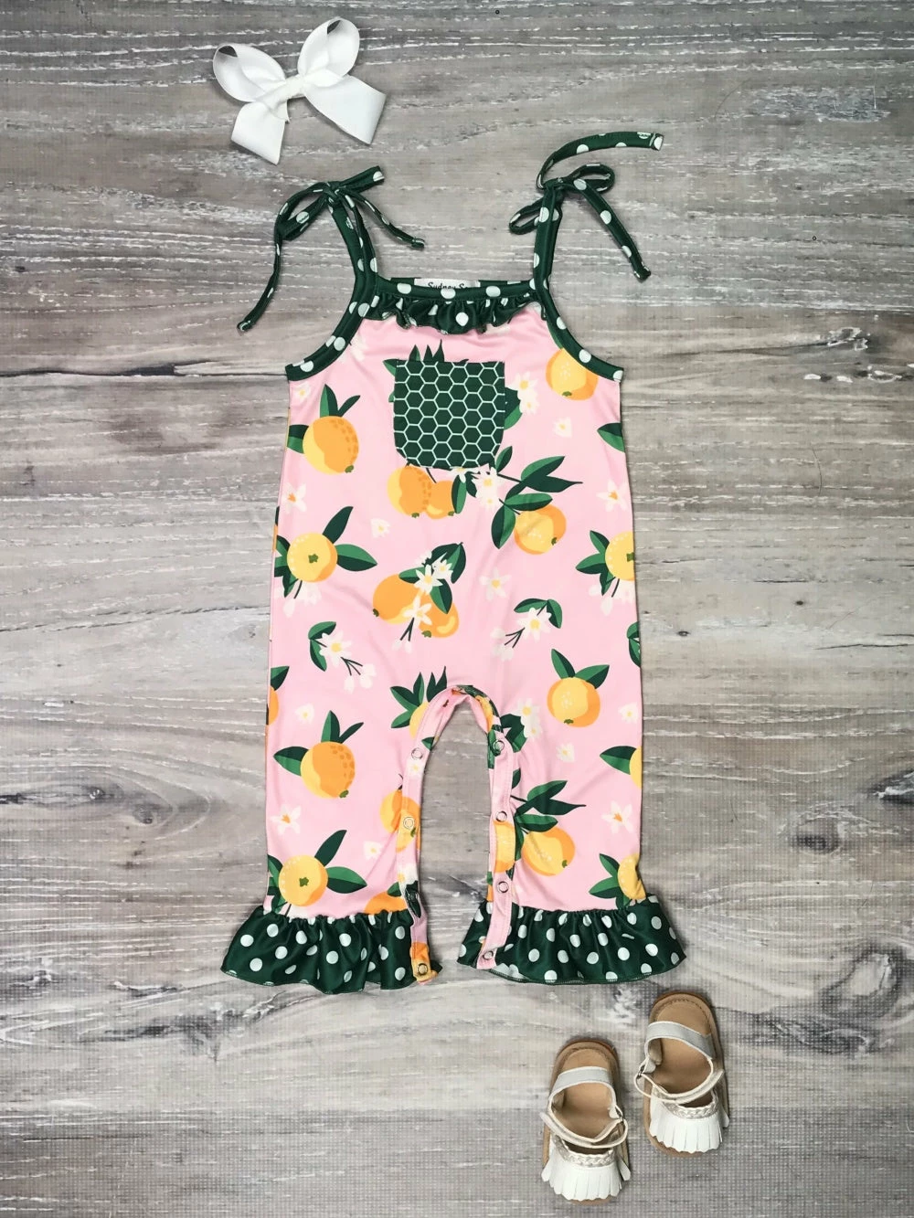 Squeeze your little one into our darling Main Squeeze Citrus Green & Yellow Polka Ruffle Baby Girls Romper! The sleeveless pink romper features a green polka dot pattern, tie straps, a lemon pattern, ruffle trim, and snaps. We are loving the snaps feature as it makes for quick and easy diaper changes. The romper is perfect for parties, playdates, running errands, picnics, and so much more. Just pair the romper with some sandals and a coordinating hair bow and your little cutie will be ready for the day. Be sure to pick up this best selling baby romper and be sure to checkout our other fashion forward baby rompers and outfits.
