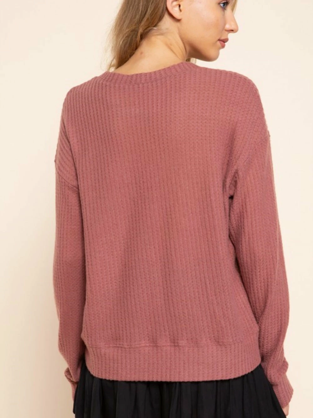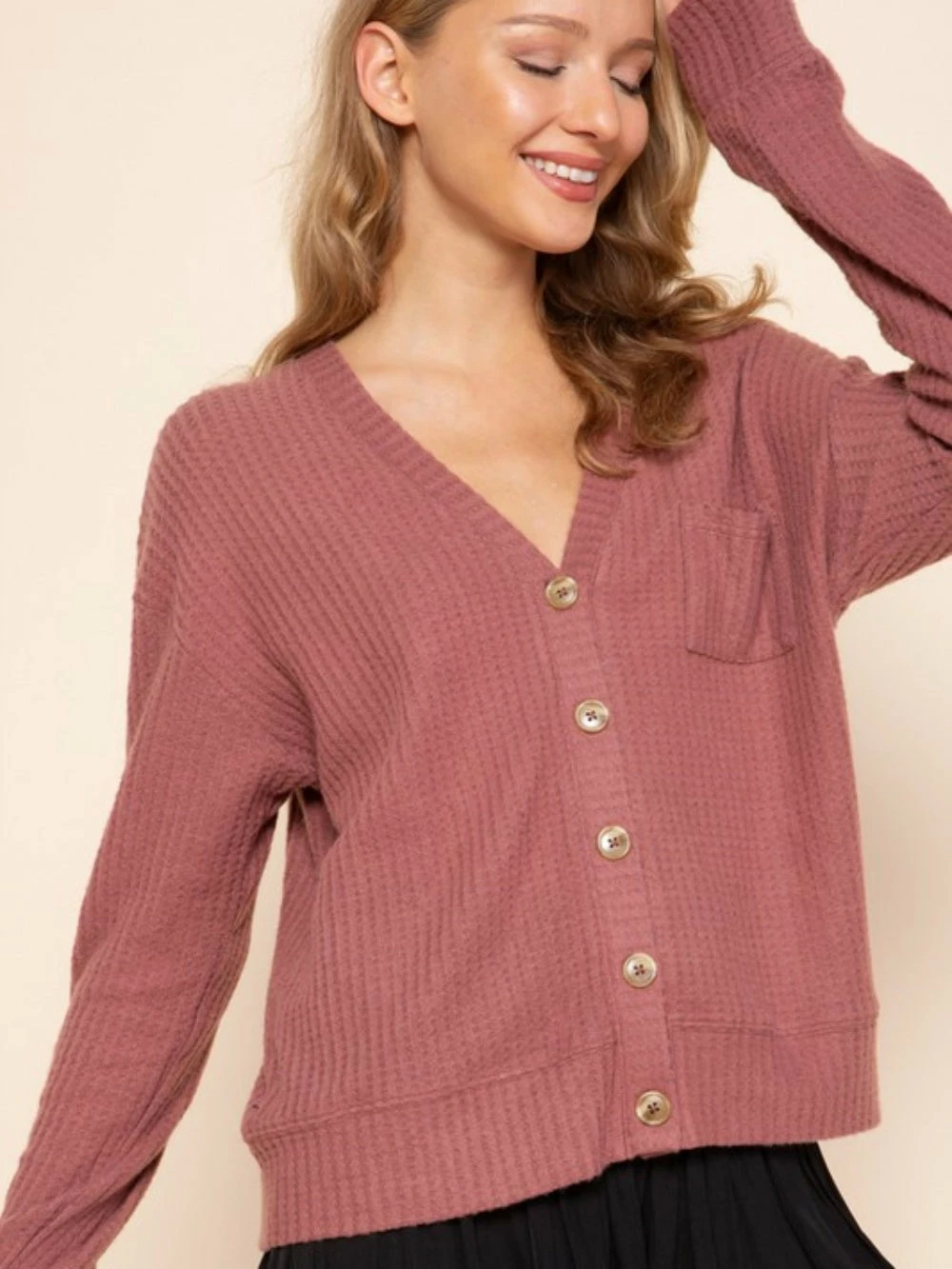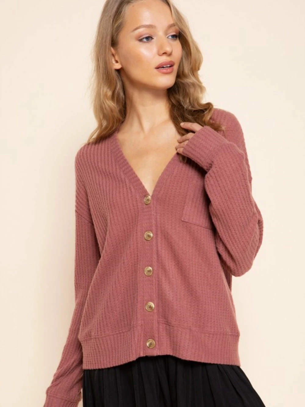 The color of our Marsala Button Up Brushed Waffle Knit Women’s Cardigan is everything! Not to mention the style as well. The trendy pink cardigan features a loose fit with a soft waffle knit fabric. We love the added details of the wooden buttons. Greatest part about this little number? You can wear it buttoned up as a v-neck top or leave it as an open cardigan with an SSS bodysuit or graphic tee. Perfect for fall or winter festivities, running errands, lounging, and so much more! We’re feeling an add to cart type of day.